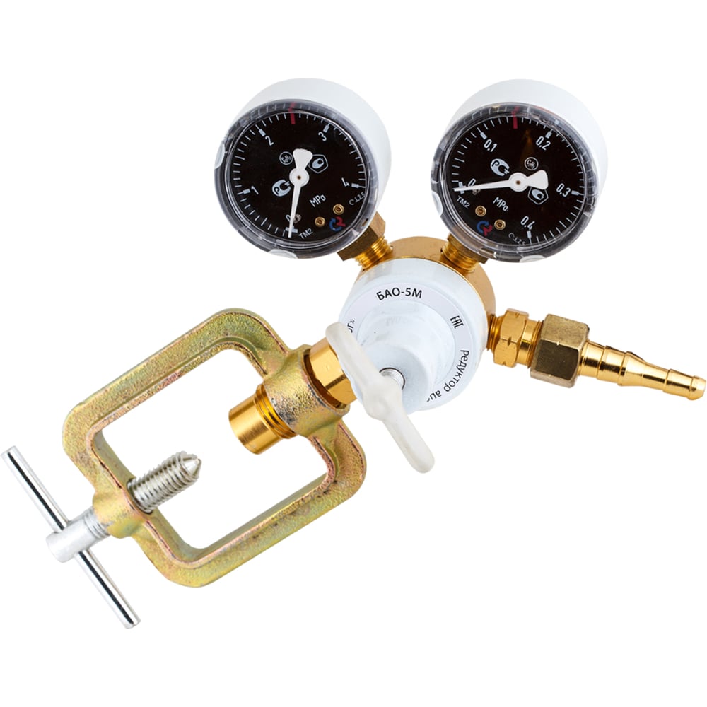 Редуктор БАО-5М AR-137A Сварог 94479 предназначен для регулирования, поддержания и формирования необходимого давления, поступающего из баллона. Два манометра обеспечивают контроль давления на входе и в камере рабочего давления. Подсоединяется к газовому баллону и рукаву для последующей подачи газа.