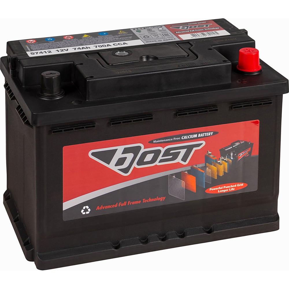 Аккумулятор автомобильный BOST 57412 (74R 700A 276x175x190) 451154. Отличительные преимущества: 1. Решетка, изготовленная по новейшей технологии “Punched Grid” повышает устойчивость к коррозии и продлевает срок службы; беспрепятственное прохождение электрического тока за счет однородности решетки; уменьшение саморазряда и повышение пуско вого тока; наличие рамки по периметру обеспечивает надежность конструкции; защита от внутреннего короткого замыкания за счет применения широких перемычек крепления пластин и прочного сцепления активных масс. 2. Микрофибра и специальный микропористый материал улучшает сцепление активных масс; увеличивает пуско вой ток и срок службы, 3. Особая конструкция решетки увеличивает срок службы батареи на 20%. 4. Встроенный искрогаситель предотвращает возможность взрыва; минимизирует утечку кислоты. 5. Обработанная химическим составом пластина активная масса высокой плотности; повышает устойчивость к вибрации; обеспечивает соответствующую емкость для мощных дизельных двигателей. 6. Сепаратор-конверт для низкого электросопротивления обеспечивает высокую пусковую мощность и износостойкость; предотвращает короткое замыкание. 7. Горячее плавление уменьшает вибрацию, тем самым продлевая срок службы батареи; предотвращает «проращивание решетки» и короткое замыкание между пластинами. 8. Эксклюзивные запатентованные терминалы производства HOFFMANN POWER SOLUTIONS, Германия предотвращают утечку кислоты; высокая устойчивость к коррозии.
