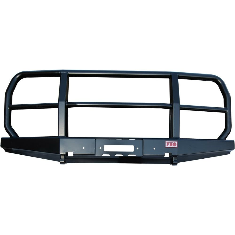 Силовой передний бампер РИФ УАЗ Буханка с защитной дугой, облегчённый *без внутренних усилителей RIF452-10600 функционален и прочен как усиленный, способен защитить переднюю часть автомобиля на бездорожье и в городе, особенно если не предполагается жесткой эксплуатации. Бампер с кенгурином не только защитит, но и украсит внедорожник благодаря эффектному и элегантному дизайну, при установке не требует серьезных переделок. Универсальный бампер подходит для стандартного автомобиля или автомобиля с лифтованным кузовом. Причем бампер может быть переставлен под лифтованный кузов, или наоборот в любой момент. Бампер не оснащен интегрированной площадкой для лебедки, ее нужно докупать отдельно - площадка РИФ устанавливается в раму. В бампере имеется отверстие под трос лебедки. Бампер «РИФ» оборудован мощными упорами под реечный домкрат и буксирными проушинами для работы с рывковым тросом или буксировочной стропой. Черная порошковая окраска защищает от коррозии в любых условиях эксплуатации и не боится самых агрессивных реагентов. При желании можно заказать бампер без покрытия и окрасить его в цвет автомобиля. Весь силовой обвес РИФ сертифицирован в Российской Федерации. Кронштейны крепления входят в комплект поставки. При необходимости можно дополнительно приобрести кронштейны, позволяющие установить этот бампер на машину с лифтом кузова 100 мм.