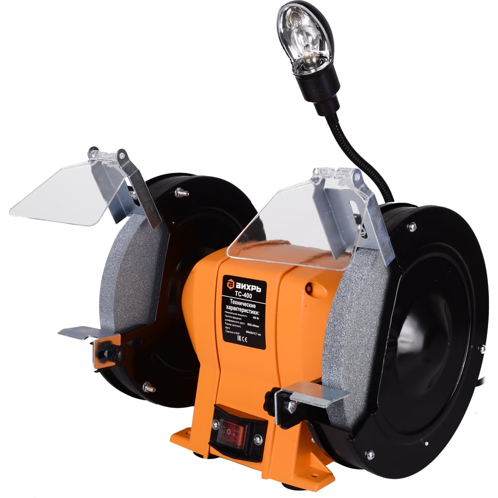 Вихрь ТС-400 представляет собой простой в эксплуатации точильный станок с алюминиевым корпусом. Номинальная мощность в 400 Вт позволяет затачивать ножи, стамески и иной режущий инструмент. Подсветка рабочей зоны в виде гибкой лампы предусмотрена для комфортной работы вне зависимости от времени суток. Двигатель асинхронного типа обладает меньшей вибрацией и хорошей частотой вращения 2950 оборотов. На валовой части ротора электродвигателя закреплены шлифовальные круги 200x20 мм (диаметр x толщина). Посадочный диаметр круга составляет 12.7 мм. Электроинструмент с вмонтированными защитными кожухами продуман с точки зрения безопасности: защитный экран из пластмассы предотвращают попадание в глаза металлической стружки при заточке; рабочий упор для надежной фиксации инструмента, чтобы он не вырвался из рук; встроенный искрогаситель предусмотрен для отражения окалины.