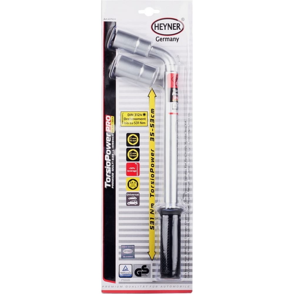 Телескопический баллонный ключ Heyner 17/19; 21/23 max до 53 см 417100 подходит для ремонта практически любого автомобиля. Телескопическая рукоятка выдвигается до 53 см, что обеспечивает комфортный доступ к крепежу в труднодоступных местах. Инструмент выполнен из высококачественной хромованадиевой стали. Материал отличается надежностью и долговечностью. В комплекте универсальные насадки 17х19 и 21х23 мм.