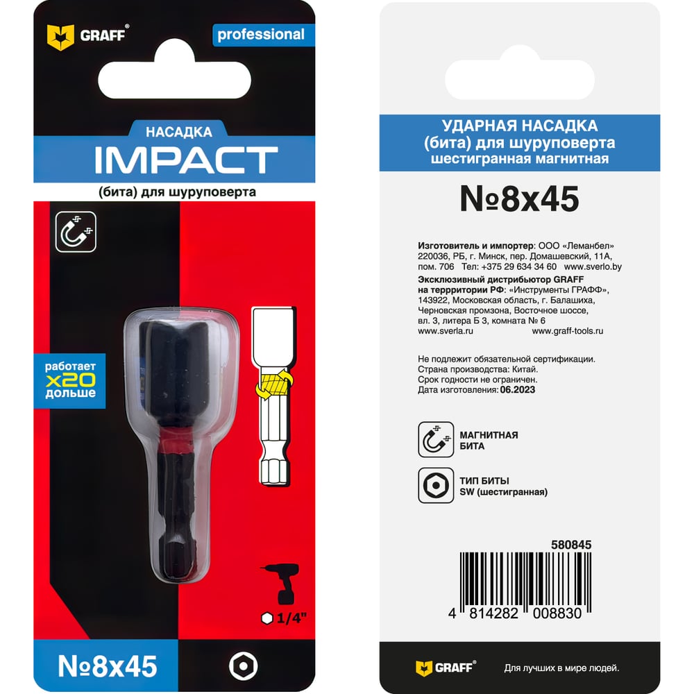 Бита Graff серии Impact SW 8х45мм, шестигранная магнитная - предназначена для работы с кровельными саморезами или саморезами по металлу, имеющими шестигранную головку. Уникальная форма насадки значительно увеличивает ее производительность за счет преодоления пиковых вибраций инструмента и компенсации ударной нагрузки. Благодаря гибкости и прочности материала биты IMPACT GRAFF отлично справятся с любым спектром задач по монтажу резьбовых соединений. По сравнению с обычными насадками биты IMPACT GRAFF отличаются повышенной долговечностью и износостойкостью, гарантируют качественную и эффективную работу.