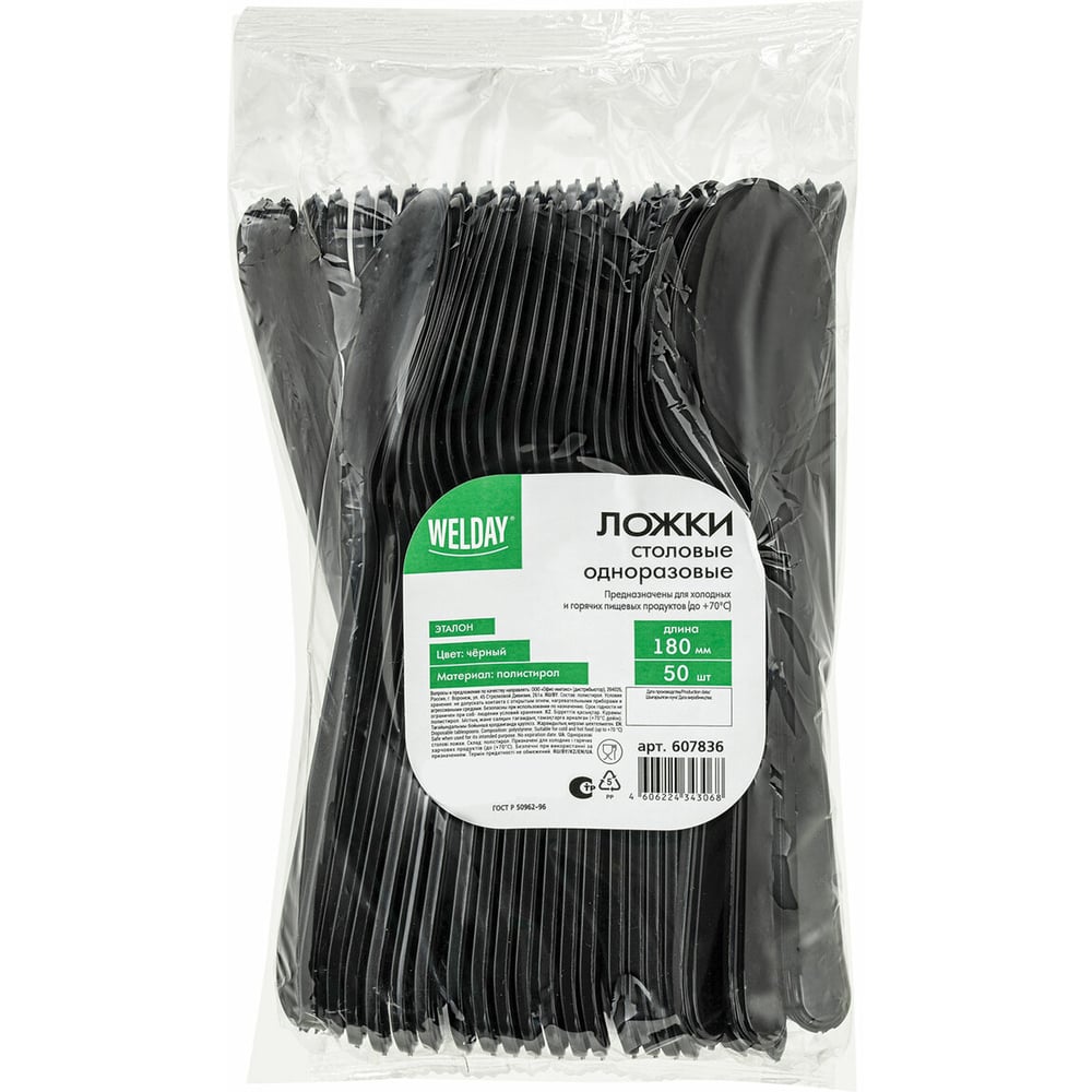 Одноразовые столовые ложки WELDAY используются в офисе, на предприятиях общественного питания, в дороге и быту.Приборы изготовлены из высококачественного пищевого полистирола черного цвета, поэтому они легкие и безопасные в использовании.Подойдут как для холодных, так и для горячих (до +70 °C) блюд.Длина – 180 мм.