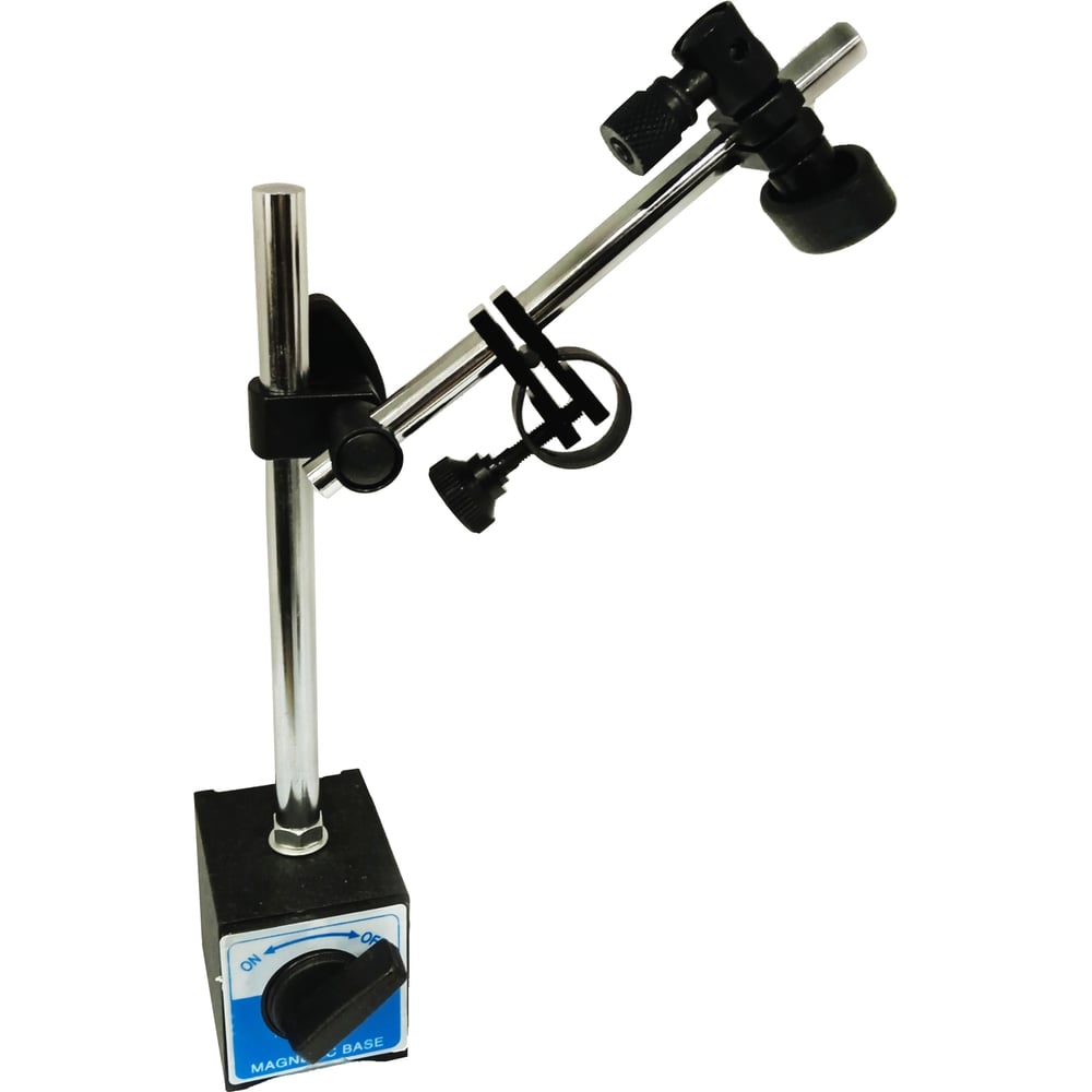 Индикаторная магнитная стойка Проф-магнит СИШ-01-80 используется для закрепления индикаторов и прочих измерительных приборов. Фиксация осуществляется двумя регулировочными винтами. Индикатор устанавливается в регулируемый зажим. Дополнительное регулируемое соединение в плече стойки. Общая длина стойки 350 мм. Диаметр отверстия под индикаторную головку d 8 мм, 10 мм и ласточкин хвост. Высота неподвижного стержня от основания: 174 мм. Длина подвижного стержня – 152,5 мм. (± 5 мм.) Изменяется посредством регулировки м/винта. Магнитное основание защищает штатив от случайных перемещений и опрокидывания, а также даёт возможность установки на вертикальных поверхностях. Механизм тонкой подачи позволяет точно выставить направление измерения (перпендикулярно к поверхности измерения).