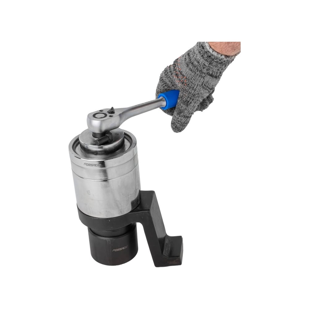 Набор инструментов с мультипликатором, головками и трещоткой от бренда Forsage предназначен для выполнения работ в автомобильной и мототехнике, а также в других строительных областях, где требуется приложение больших усилий. Мультипликатор – это усилитель крутящего момента. Прецизионный инструмент, предназначенный для работы с резьбовыми соединениями (откручивания и закручивания гаек и болтов) при монтажных и демонтажных операциях. В основу работы мультипликатора положен редуктор планетарного действия и силы реакции опоры. За счет редуктора инструмент позволяет многократно усилить крутящий момента на входе. С его помощью можно легко и быстро откручивать и закручивать гайки. Удобство использования. Наиболее распространены ручные механические мультипликаторы которые имеют ряд преимуществ таких как компактные размеры и малый вес, автономная работа, не требуется источник питания или дополнительное оборудование, доступность для широкого круга потребителей, лёгкость в применении, безопасность работы за счет уменьшения длины рычага и усилия оператора, минимизация трудовых затрат. Мультипликатор применим в труднодоступных местах и стесненных условиях. Он способен заменить гайковерты электрического и пневматического типа, и занимает гораздо меньше места. Основные характеристики механического мультипликатора: коэффициент усиления 1:23.4, максимальное усилие 5500 Н/м, входной квадрат 12.7 мм (1/2"), выходной квадрат 35 мм. Набор поставляется в прочном металлическом кейсе с застежками.