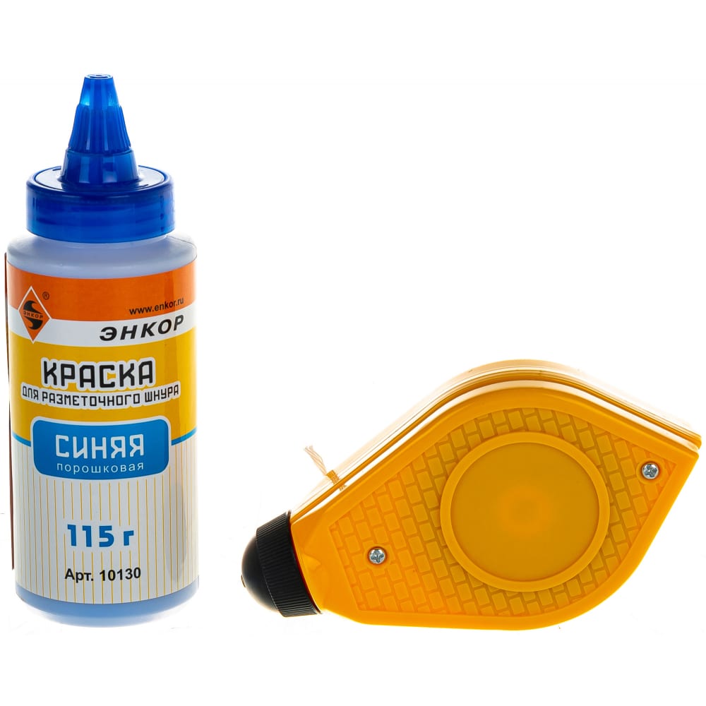 Разметочный набор (краска синяя) Энкор 10125 включает в себя прочный хлопковый шнур, который помещен в корпус из АВС пластика, и порошковое красящее вещество (115 г). Благодаря крючку для закрепления начальной точки разметка потолка, пола или стен осуществляется максимально легко и быстро. Рукоятка эргономичной формы способствует удобной намотке и разматыванию нити.