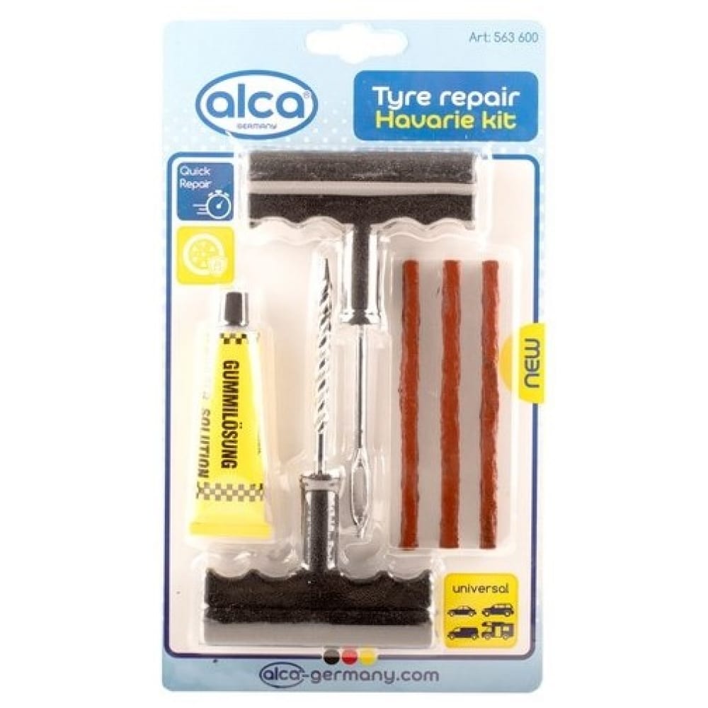 Набор для ремонта шин Alca 6 предметов, 3 ремонтных вставки, клей, инструмент 563600 для экстренных ситуаций на дороге: позволяет произвести ремонт шины вне специализированных мастерских. Надежная герметизация прокола. В комплекте: клей-активатор, инструмент для зачистки отверстий, инструмент для введения ремонтной вставки, ремонтная вставка (3 шт).