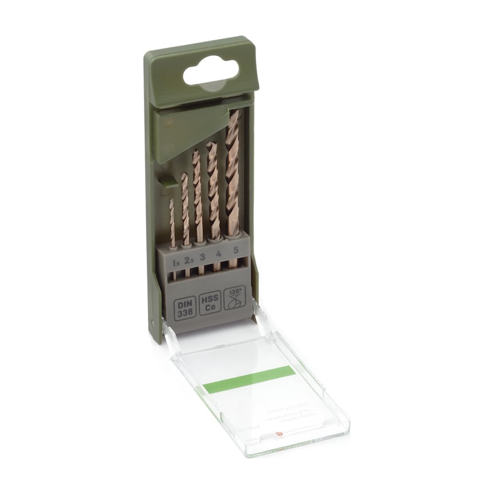 Набор свёрл по металлу Cobalt 5% 5 шт Дело Техники 211205 рассчитан на работу с материалами высокой твёрдости. Легирование кобальтом обеспечивает более высокую термостойкость, что значительно продлевает срок службы сверла. Крестообразно подточенная вершина и угол заточки 135° обеспечивают самоцентрирование, что снижает возможность «хождения» сверла при засверливании и уменьшает нагрузки при сверлении. Состав набора: Ø 1.5, 2.5, 3, 4, 5 мм Сталь P6М5К5 Твердость: 64 - 67 HRC