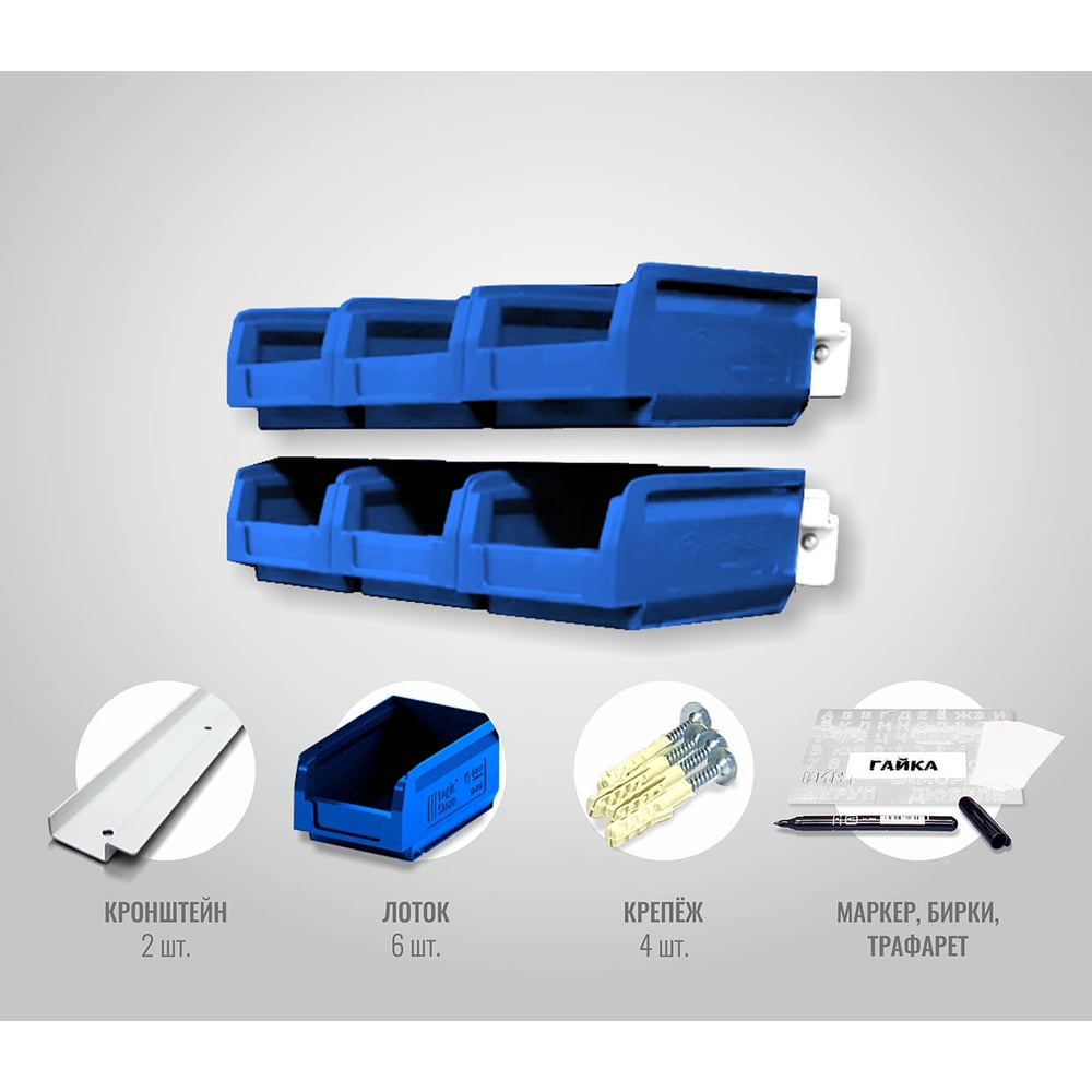 Надежный помощник в организации рабочего пространства мастерской и сборочного цеха. Вы не просто разложите все по своим местам, вы сможете дать им адреса, ведь все уже в комплекте. Представлен в виде двух независимых кронштейнов длиной 300мм, умещающих на себе по 3 лотка размером 165х100х75. Его размеры позволяют разместить точки хранения в очень ограниченном пространстве. Грузоподъемность каждого из лотков до 2,4кг в подвешенном состоянии. Грузоподъемность кронштейна до 50кг. Для вашего удобства органайзер укомплектован адресными бирками, маркером и трафаретом. Вам останется лишь прикрутить, разложить, подписать и порядок! Характеристики: Тип: органайзер Материал: сталь + полипропилен Исполнение: настенное Цвет: белый + синий Габарит уп: 300х180х100мм Вес: 1 кг