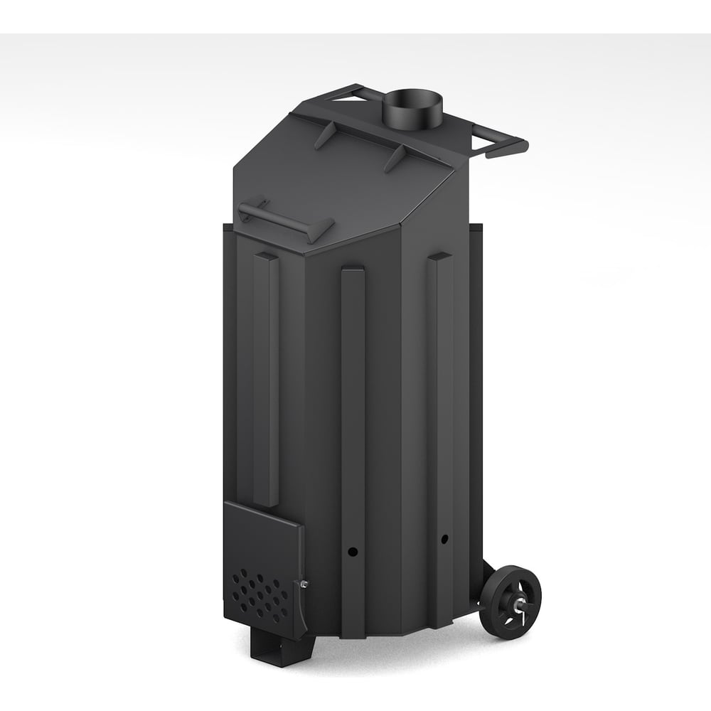 Передвижная печь с крышкой и дымовой трубой позволяет сжигать на приусадебном участке садовый и огородный мусор закрытым способом. Вместительность бункера - 160 л. Вторичный воздух поступает в топку по закрытым каналам, которые не дают горящим искрам и пеплу вылетать наружу. Печь перемещается на колесах за удобную ручку. Мы доставляем наши изделия по России транспортными компаниями до пункта выдачи заказов или до адреса получателя. Габаритные размеры с трубой, ВхШхГ, мм 2000х600х600 Диаметр дымохода, Ø 133 Объем топки-бункера, л 160 Масса печи, кг 55 Проем крышки, ВхШ, мм 325х490 Проем дверцы, ВхШ, мм 210х250 Вторичный воздух проникает в топку через множество отверстий в корпусе. Закладка наполняется воздухом: производительность печи возрастает, мусор сгорает быстро и полностью. Каркас печи и крышка изготовлены из прочной стали толщиной 2 мм, колосник - 3 мм. Конструкция усилена боковыми изгибами стенок топки - ребрами жесткости. Печь перемещается на колесах за удобную ручку. Верхний проем для мусора закрывается откидной крышкой на шарнирах. Зола удаляется через нижнюю дверцу. Мусор можно сжигать двумя способами: снизу через дверцу и сверху через крышку. На печь устанавливается дымоход: тяга усиливается, возрастает температура пламени в топке, дым отводится в сторону от крышки загрузочного проема. В зависимости от состава мусора, чтобы закладка полностью сгорала, иногда требуется ворошить угли. Труба дымохода поставляется в комплекте. Приспособление легко устанавливается и снимается.