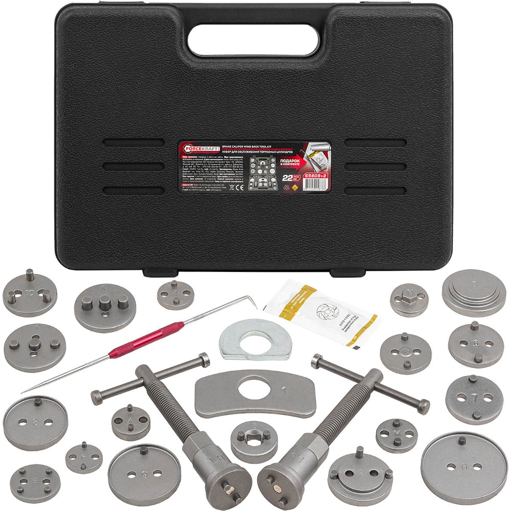 Набор из 22 предметов для обслуживания тормозных цилиндров от бренда Forcekraft. Комплект предназначен для вдавливания цилиндров автомобильных суппортов при ремонте и обслуживании тормозной системы.Продуманность комплекта. Набор включает в себя различные инструменты, необходимые для выполнения различных операций по обслуживанию тормозных цилиндров, включая снятие, установку, регулировку и замену деталей. Наличие всех необходимых инструментов в одном наборе упрощает и ускоряет процесс обслуживания.Качество. Инструменты изготовлены из высококачественных компонентов и комплектующих, что обеспечивает долговечность и надежность набора при выполнении задач по обслуживанию тормозных цилиндров.Удобство. Набор поставляется в удобном кейсе, который облегчает хранение, транспортировку и организацию инструментов.