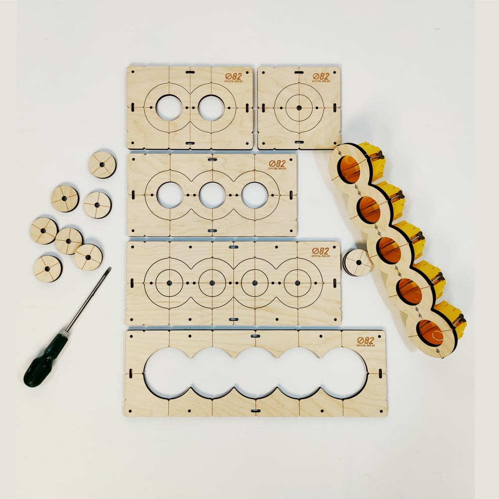 Комплект шаблонов для сверления подрозетников 5 шт, 82 мм, толщина 8 мм, расстояние 71 мм РОТОР Shablon-v3-82 - исключают деформацию шаблона, очень прочные, надежные, имеют долгий срок службы. - В комплекте есть шаблоны для монтажа, которые значительно упростят установку подрозетников в высверленные отверстия. - Наши шаблоны для подрозетников изготовлены из качественной фанеры толщиной 8 мм высокого сорта 2/2, что увеличивает их ресурс, удобство при сверлении и исключает расслаивание. Коронка плотно и надёжно фиксируется в отверстии и риск вылететь при вращении отсутствует. - Шаблон предназначен для сверления отверстий для установки подрозетников в стены из бетона, гипсокартона, дерева, покрытые керамогранитом, плиткой и т.д... - С данным шаблоном вам не придется производить предварительную разметку. Просто прикрепите шаблон с необходимым количеством отверстий к стене с помощью саморезов или двухстороннего скотча и можно сразу сверлить, предварительно сняв центровочное сверло с коронки. - При групповом сверлении шаг отверстий всегда будет идеален. - При попадании коронки в профиль или в арматуру увод ее в сторону исключен, благодаря прочной основе из толстой фанеры. Отвертка и подрозетники в комплект не входят.