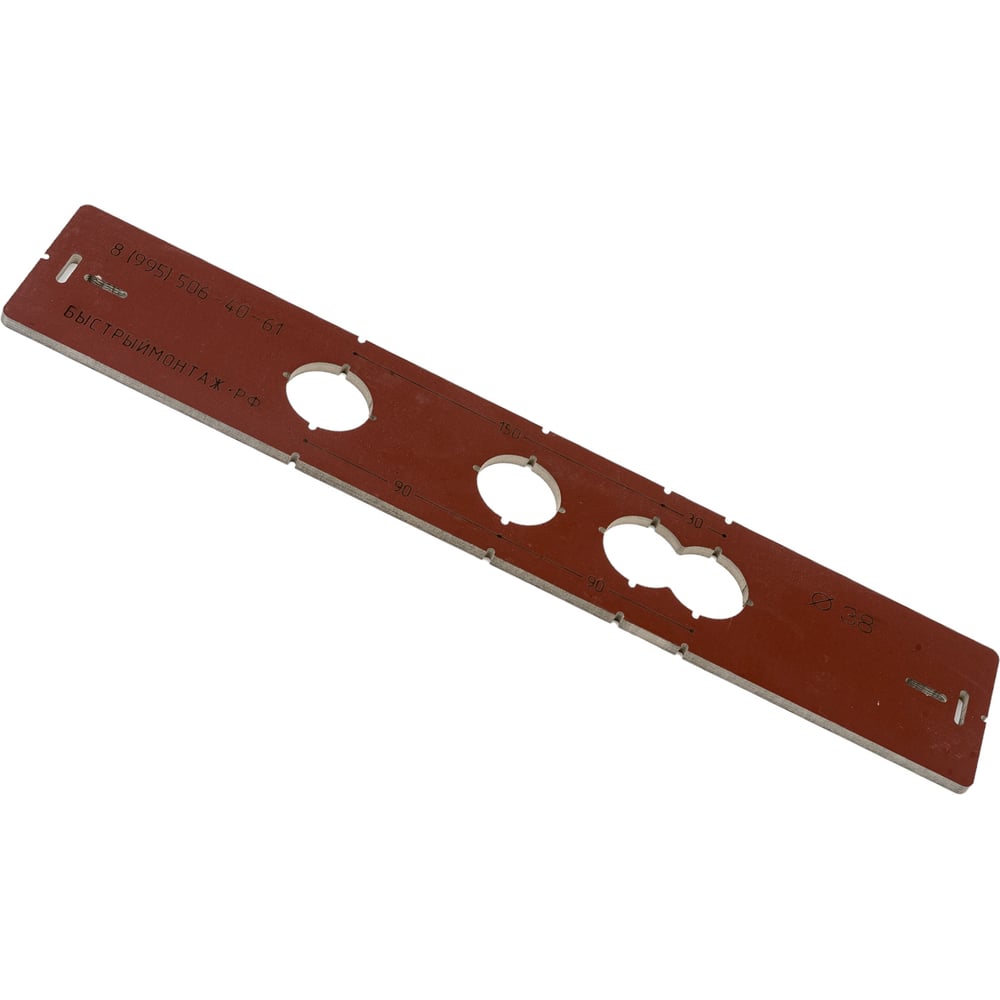 Шаблон для разметки и монтажа водорозеток из текстолита BM-023-S предназначен для быстрой разметки, а также сухого и мокрого сверления отверстий под водорозетки на стенах из бетона, кирпича, блока, гипсокартона, плитки и др. Значительно увеличивает скорость и точность монтажа водных розеток, и позволяет контролировать как единую плоскость водорозеток, так и точность их межосевого расположения Шаблон имеет отверстия диаметром 38 мм. Изготовлен из текстолита толщиной 6 мм, не боится воды, имеет большой рабочий ресурс и запас прочности.