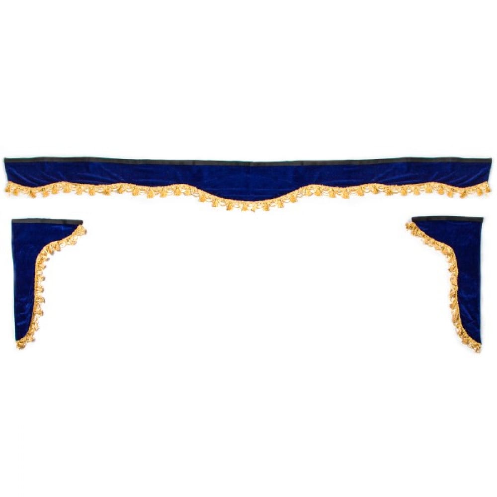 Ламбрекен лобового стекла со шторками SKYWAY 220см/33х60 синий S01203037 служит украшением лобового стекла грузовых автомобилей, а также может защитить от прямых солнечных лучей. В комплект входит один ламбрекен на лобовое стекло и две боковые шторки, а также он укомплектован двусторонней лентой-липучкой для крепления. Ламбрекен лобового стекла изготовлен из приятной и очень нежной бархатной ткани. Бархат обладает рядом полезных свойств, он стойкий к светопропусканию, что позволяет ему долго не выгорать на солнце. Перед применением рекомендуется отпарить аксессуар утюгом