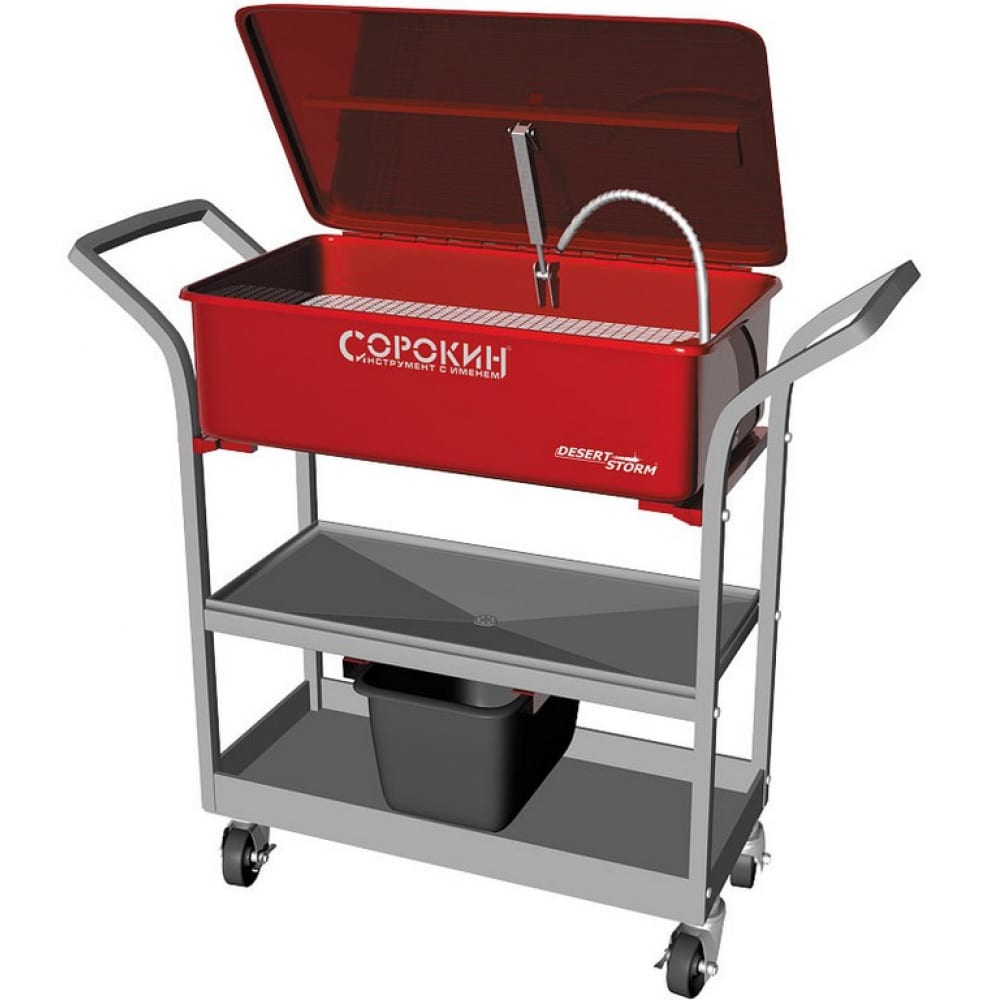 Передвижной стенд для очистки деталей Сорокин 10.32 - применяется для очистки химическими растворами и обезжиривания различных деталей в автомастерских, в гаражах, на станциях техобслуживания, на заводах и в производственных цехах. Стенд укомплектован ванной на 75 литров и фильтром для очистки воды. Аппарат можно перемещать благодаря четырем резиновым колесам и двум рукояткам. Также в конструкции предусмотрены две полочки для размещения деталей и дополнительная ванночка.