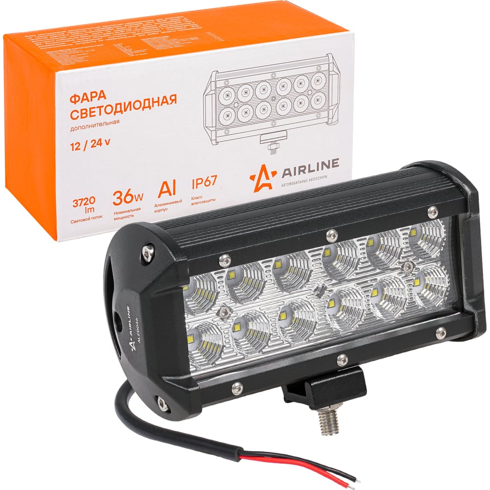 Светодиодная фара (балка) двухрядная Airline 12 LED рассеянный свет, 36W, 165x78x65, 12/24V ALED046 используется как дополнительный источник света на коротких и средних дистанциях, для движения в темное время суток, в условиях тяжелого бездорожья, сложных климатических условиях. Фара рассеянного света эффектвно освещает пространство вокруг автомобиля. Ребристый рефлектор прекрасно рассеивает световой поток на 60 градусов. Светодиодные фары легко устанавливаются и имеют возможность регулировки угла наклона и поворота. Мощность фары 36 Вт (6 светодиодов Cree 3 Вт). Высококачественные светодиоды Cree обеспечивают высокую яркость и увеличенный ресурс до 50000 часов. Электрическая схема разработана с ограничением тока, защитой от обратного напряжения. Алюминиевый корпус с объемным радиатором и теплопроводящая печатная плата с термоинтерфейсом отлично охлаждают светодиоды, продлевая срок службы изделия. Алюминиевый корпус обладает стойкостью к коррозии и температурному воздействию, полностью водонепроницаем, влагозащищен согласно европейскому стандарту IP67. Фары устанавливаются на любое транспортное средство: внедорожники, вездеходы, квадроциклы, мотоциклы, грузовики, экскаваторы, бульдозеры, краны, катера, суда, автобусы и т. д В комплекте универсальный металлический крепеж. Фары поставляются с открытыми концами кабеля, вы сами можете выбрать подходящий вам коннектор.