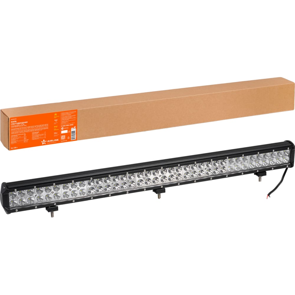 Светодиодная фара (балка) двухрядная Airline 72 LED комбинированный свет, 216W, 845x78x65, 12/24V ALED053 используется как дополнительный источник света на коротких и средних дистанциях, для движения в темное время суток, в условиях тяжелого бездорожья, сложных климатических условиях. Фара комбинированного света эффективно освещает пространство вокруг автомобиля. Комбинация 36 гладких и 36 ребристых рефлекторов создает мощный пучек направленного света в центре и освещает пространство по бокам. Светодиодные фары легко устанавливаются и имеют возможность регулировки угла наклона. Длина балки 85 см. Мощность фары 216 Вт (72 светодиодов Cree 3 Вт). Высококачественные светодиоды Cree обеспечивают высокую яркость и увеличенный ресурс до 50000 часов. Электрическая схема разработана с ограничением тока, защитой от обратного напряжения. Алюминиевый корпус с объемным радиатором и теплопроводящая печатная плата с термоинтерфейсом отлично охлаждают светодиоды, продлевая срок службы изделия. Алюминиевый корпус обладает стойкостью к коррозии и температурному воздействию, полностью водонепроницаем, влагозащищен согласно европейскому стандарту IP67. Фары устанавливаются на любое транспортное средство: внедорожники, вездеходы, квадроциклы, мотоциклы, грузовики, экскаваторы, бульдозеры, краны, катера, суда, автобусы и т. д В комплекте универсальный металлический крепеж. Фары поставляются с открытыми концами кабеля, вы сами можете выбрать подходящий вам коннектор.