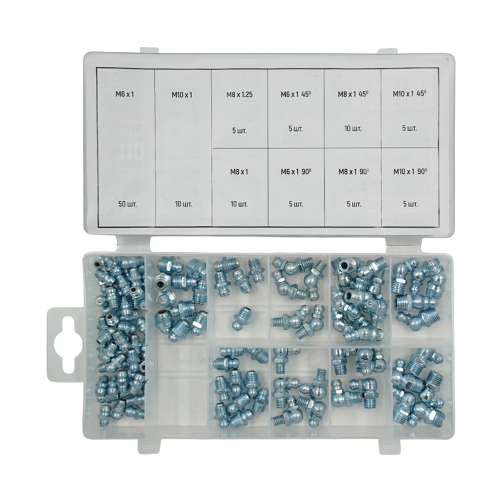 110 металлических фитингов с ниппелем в наборе WDK-214053 гарантируют прочное и герметичное соединение. В наборе представлены 10 видов пресс-масленок: прямые, угловые 45 и 90 градусов. Высокое качество материалов обеспечивает долгий срок службы.Удобный пластиковый кейс с перегородками обеспечивает надежное хранение и быстрый поиск нужного размера.Тип: наборФорма: разная (набор)