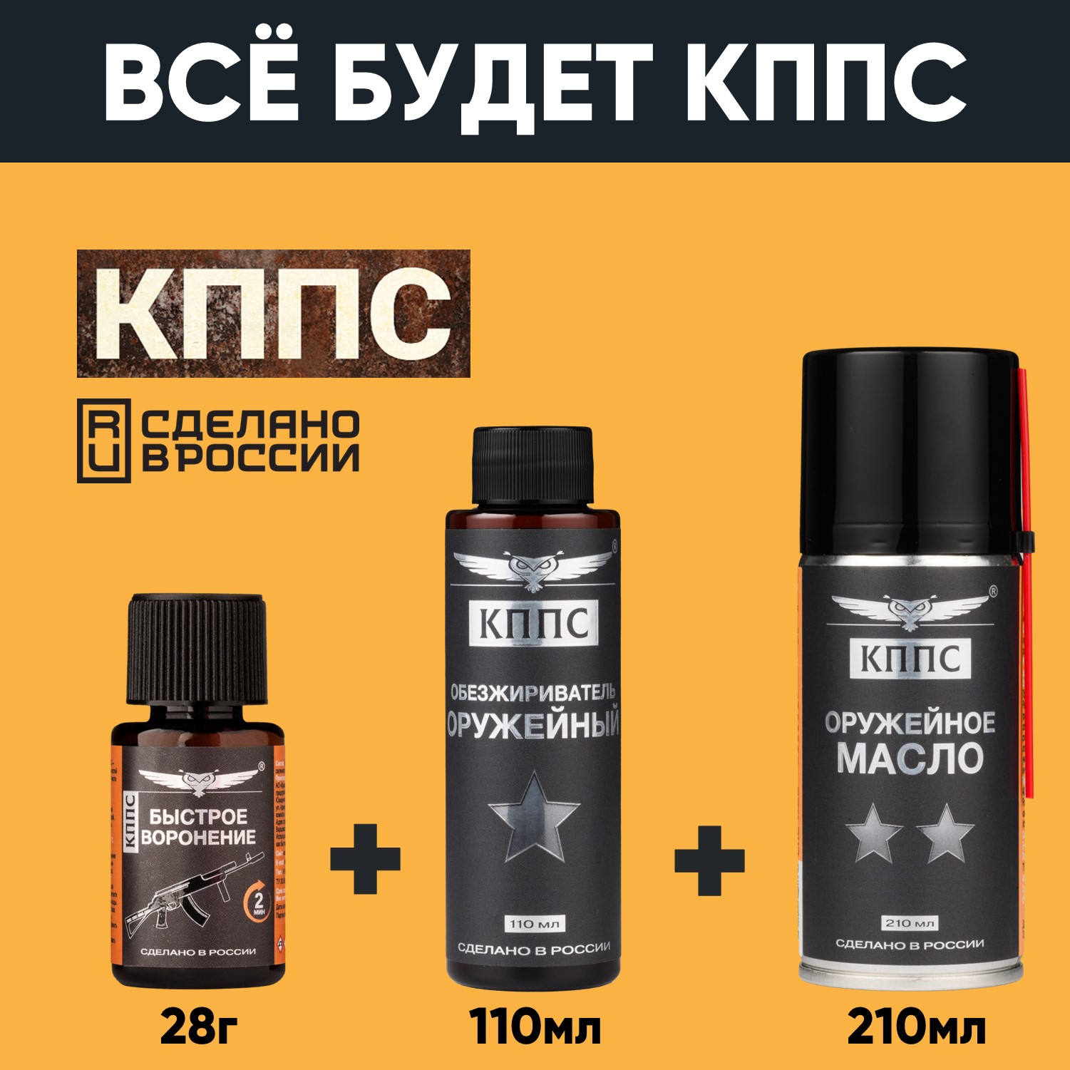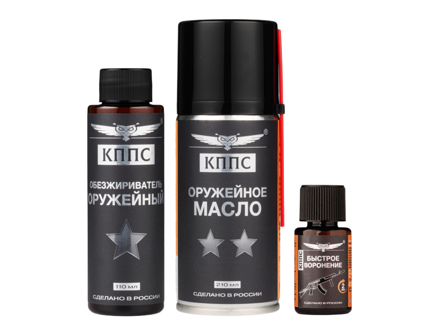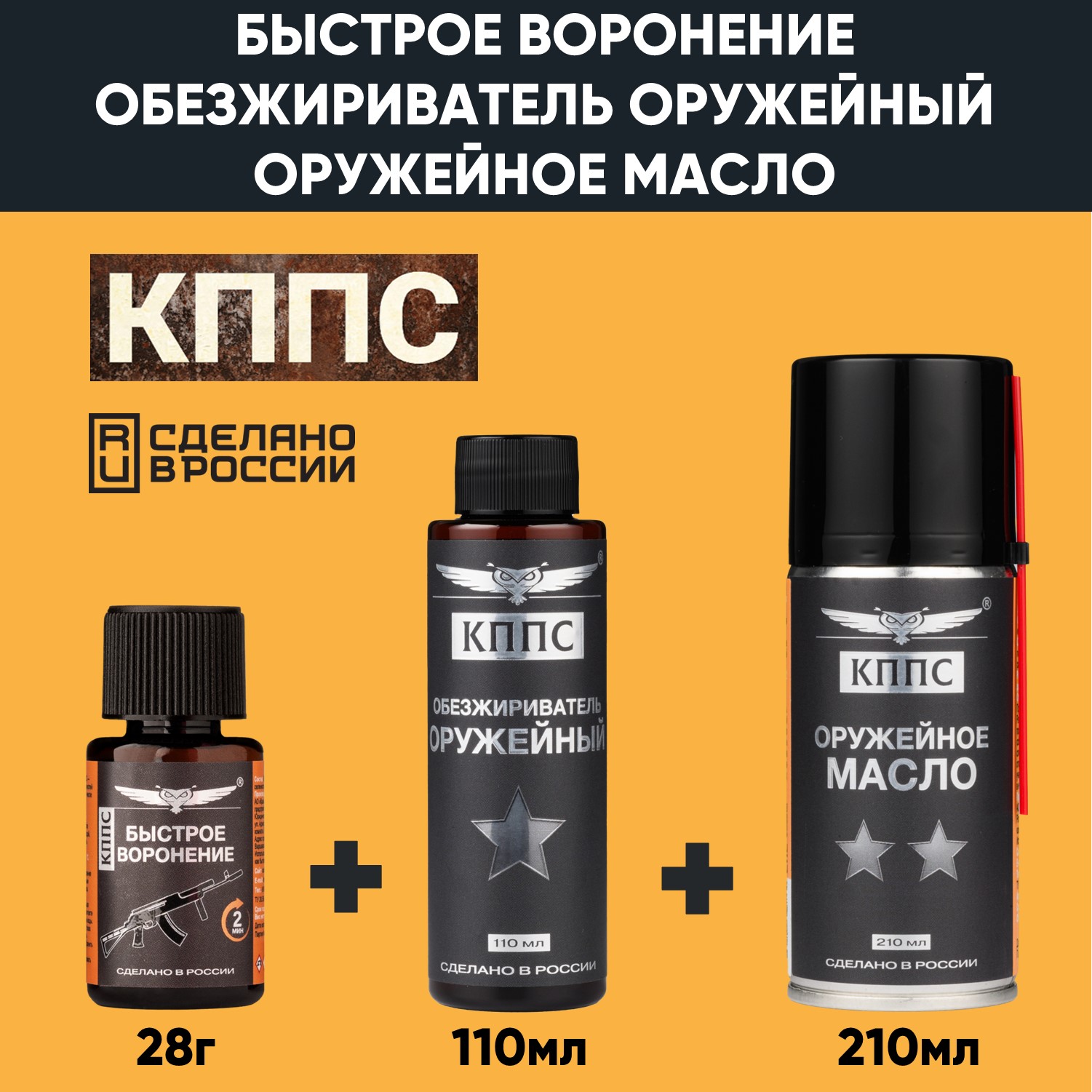 Быстрое воронение КППС (28г) + Оружейное масло КППС (210мл) + Оружейный обезжириватель КППС (110мл)