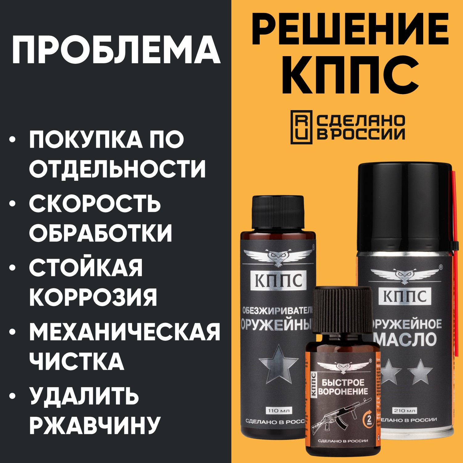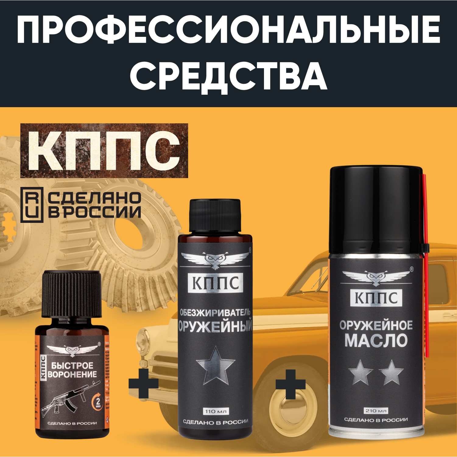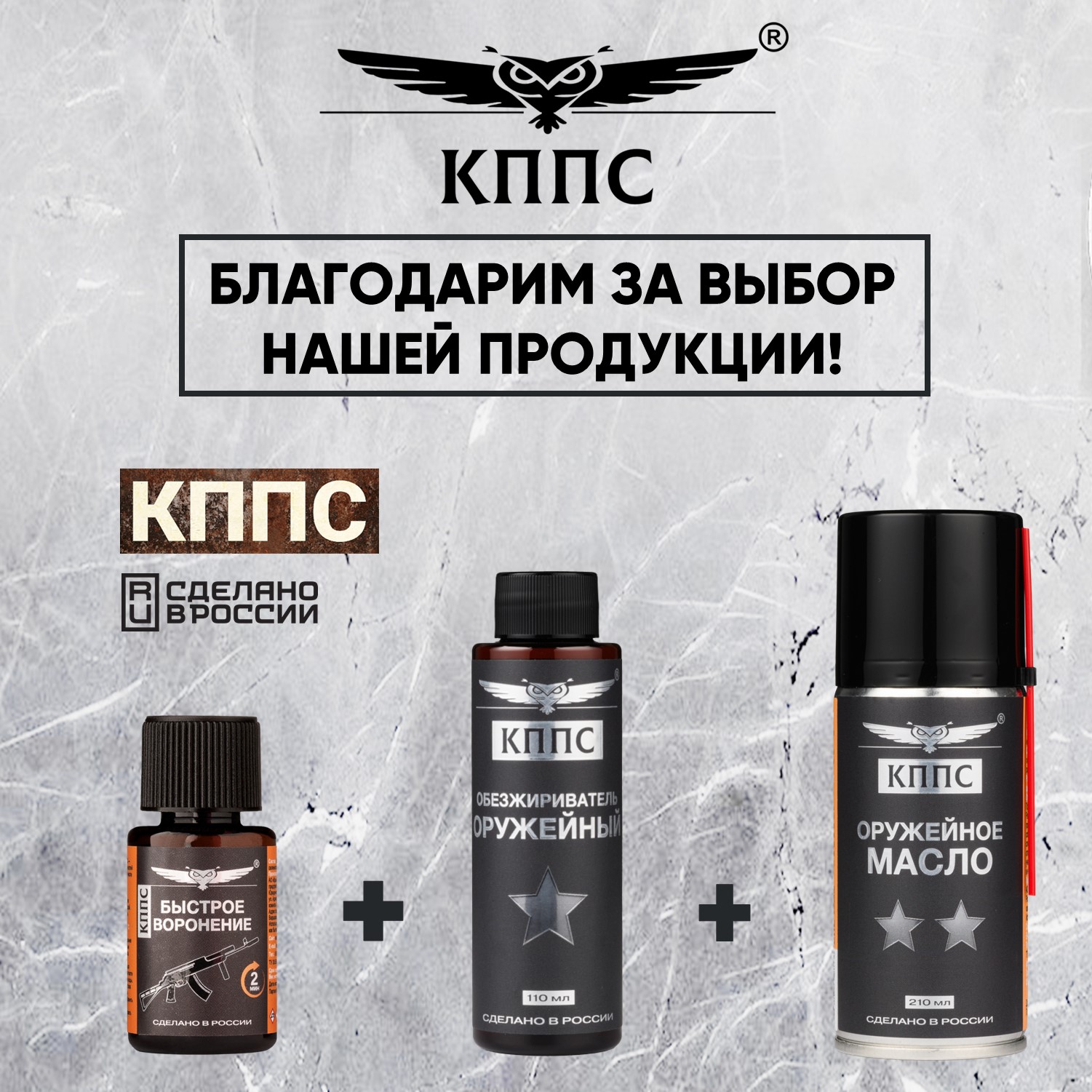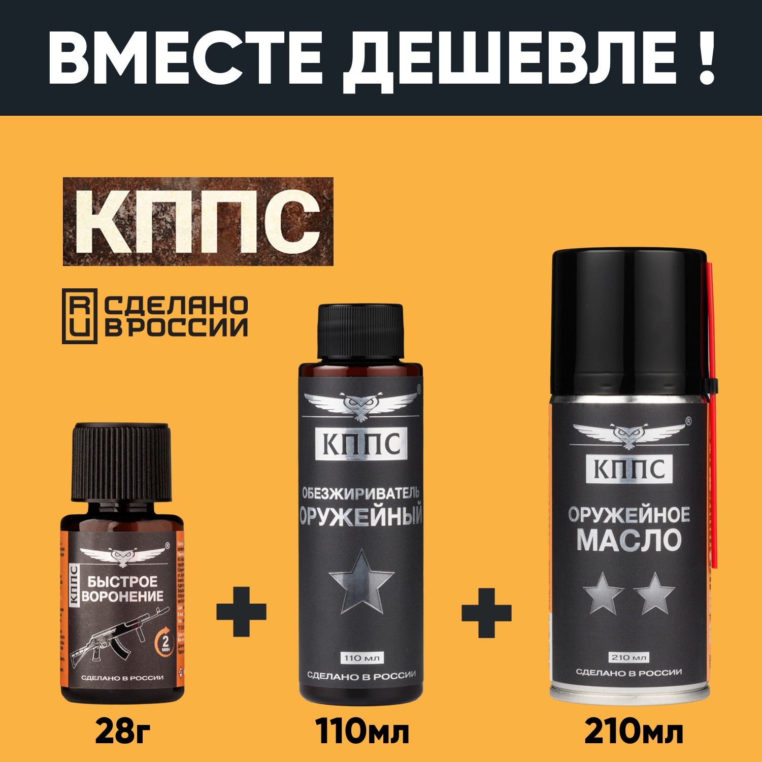 Быстрое воронение КППС (28г) + Оружейное масло КППС (210мл) + Оружейный обезжириватель КППС (110мл)