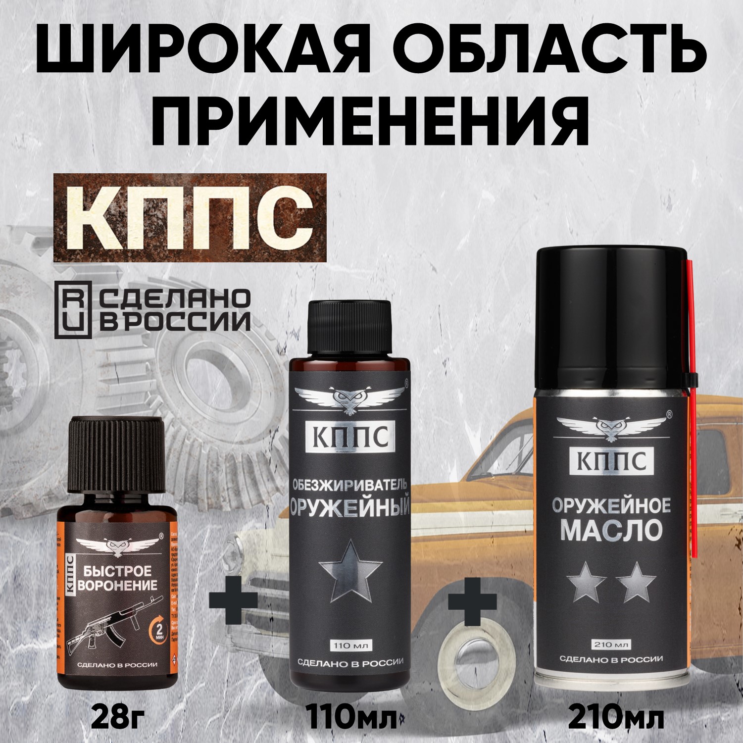 Технические характеристики Быстрое воронение КППС (28г) + Оружейное масло КППС (210мл) + Оружейный обезжириватель КППС (110мл)