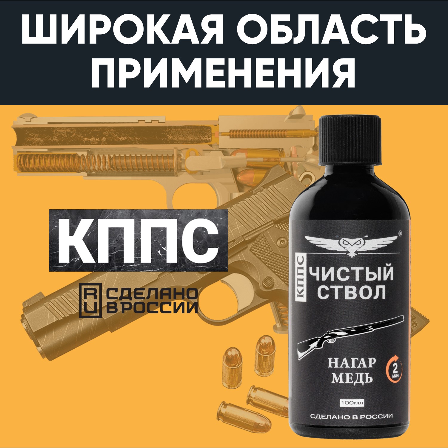 Чистый ствол КППС - эффективное средство для очистки ствола оружия, удаления нагара, омеднения, томпака и свинца. При подготовке оружия к консервации достаточно нанести очиститель ствола КППС на патч, прочистить несколько раз канал ствола до выхода чистого патча и обработать поверхность нейтральным или оружейным маслом. Окрашивание патча в голубой и зелёный цвет свидетельствует о растворении меди в канале ствола. Чистый ствол КППС подходит для очистки гладкоствольного и нарезного оружия, газоотводных механизмов и патронников любого типа. В состав входят поверхностно-активные добавки, которые позволяют раствору попадать в труднодоступные места. Концентрация Чистого ствола КППС позволяет удалить все загрязнения без заливания и выдерживания средства в стволе, чем значительно увеличивает ресурс металла.