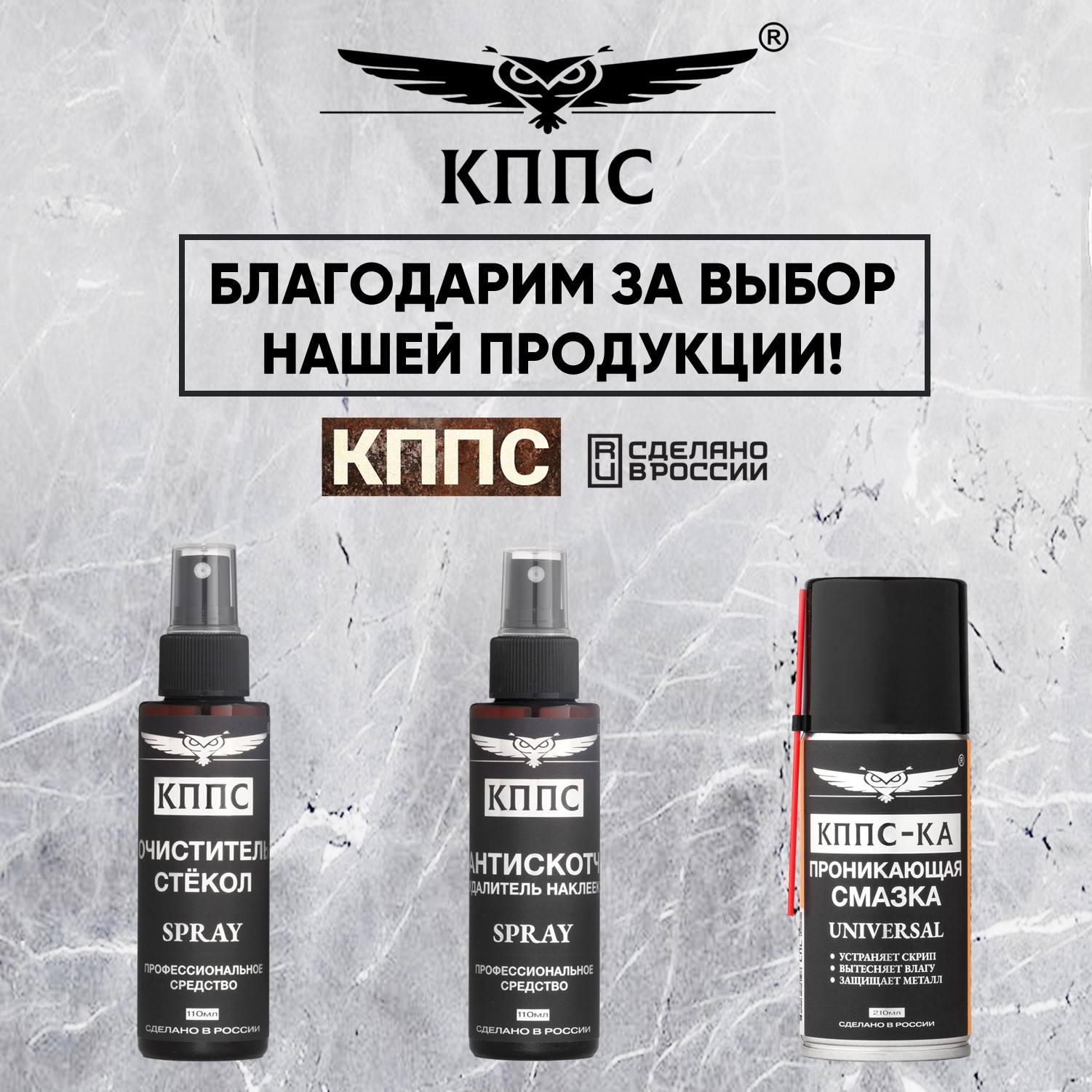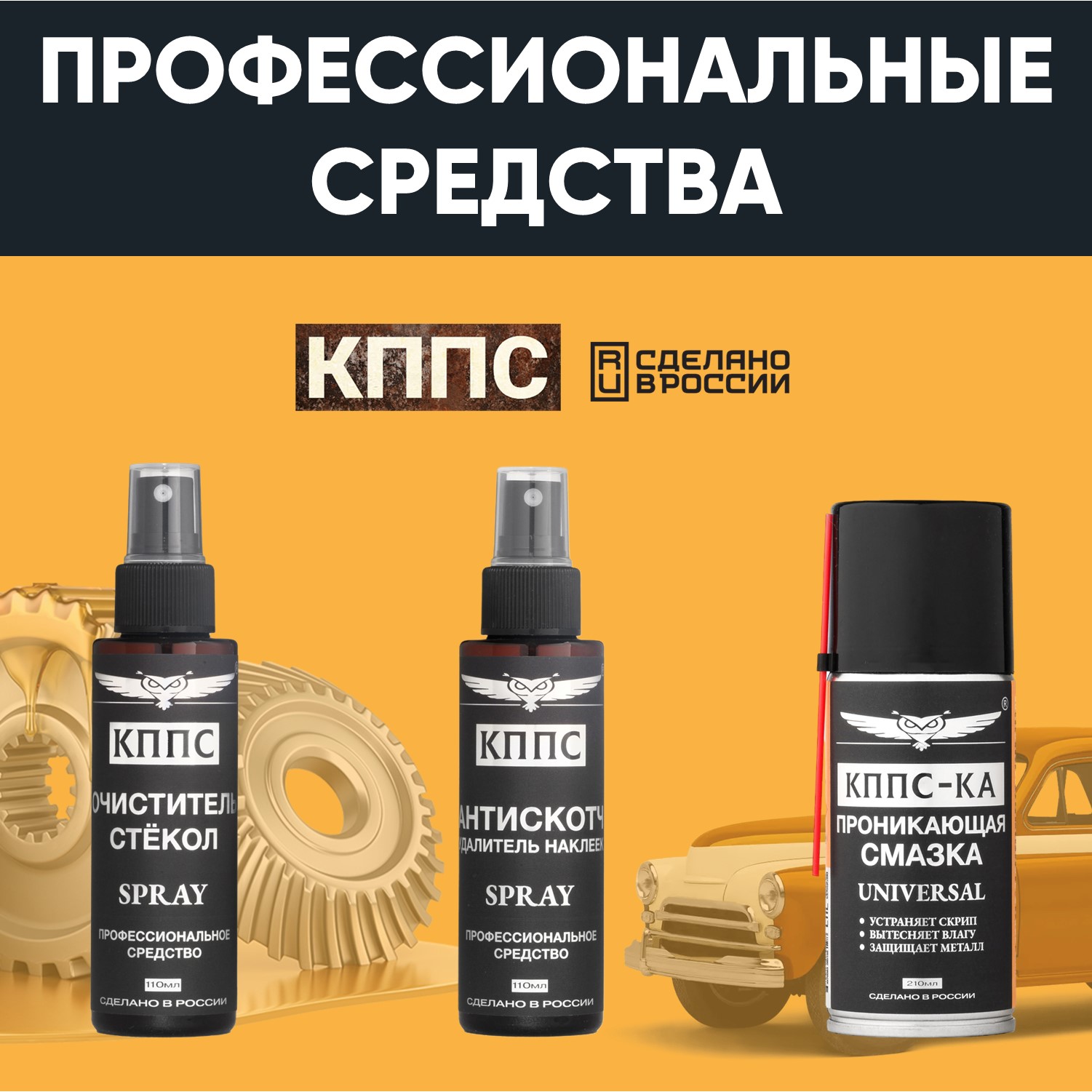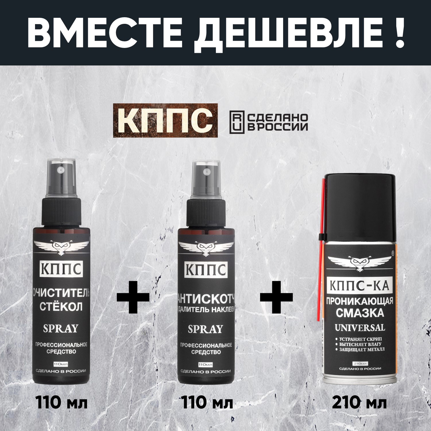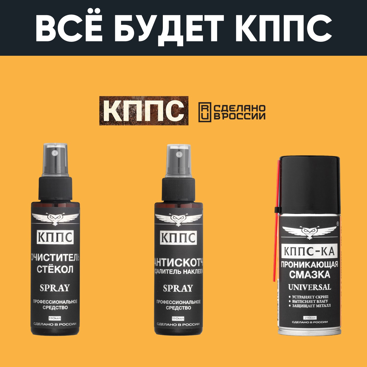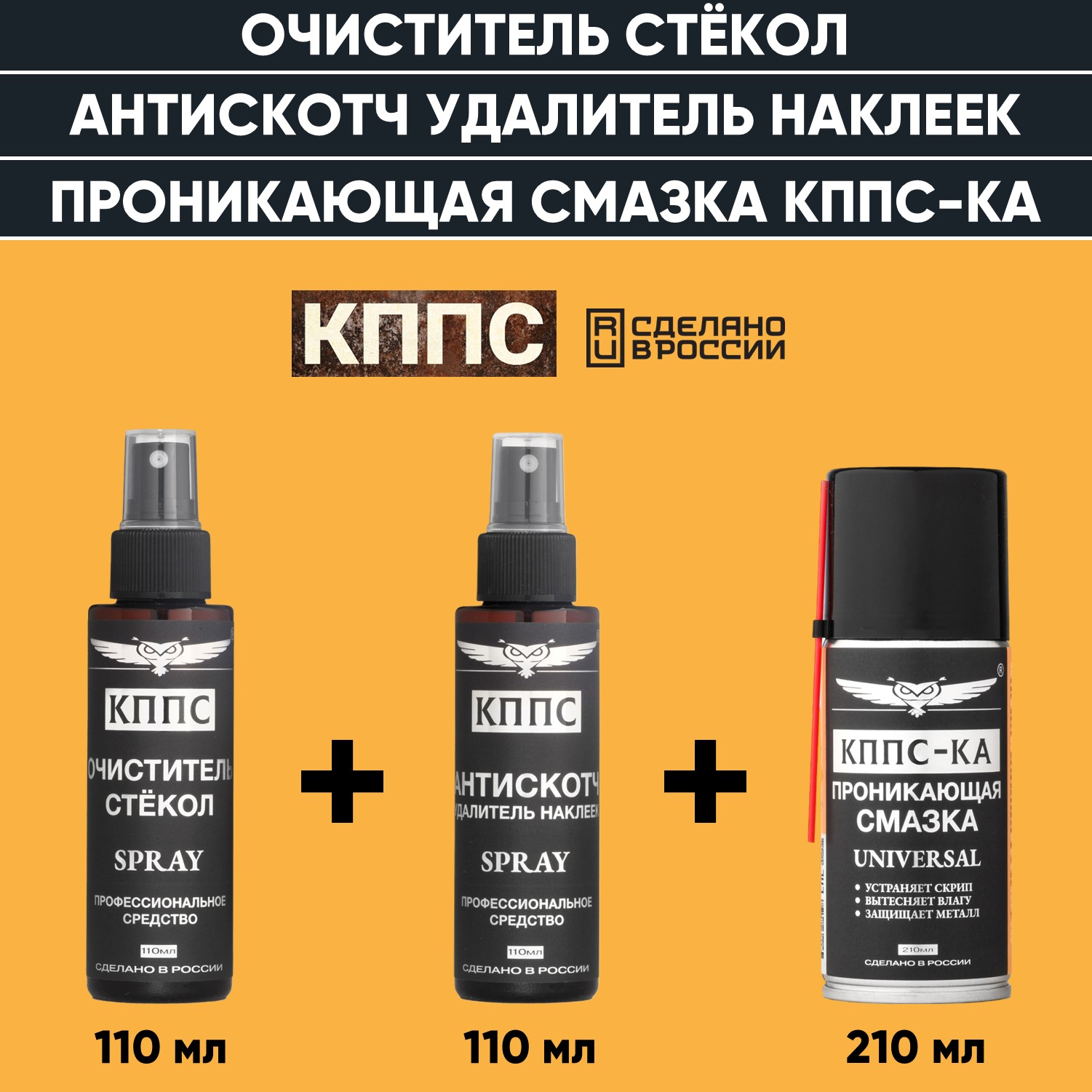 Очиститель стёкол КППС SPRAY (110мл) + АНТИСКОТЧ удалитель наклеек КППС SPRAY (110 мл) + Проникающая смазка КППС-КА (210мл)