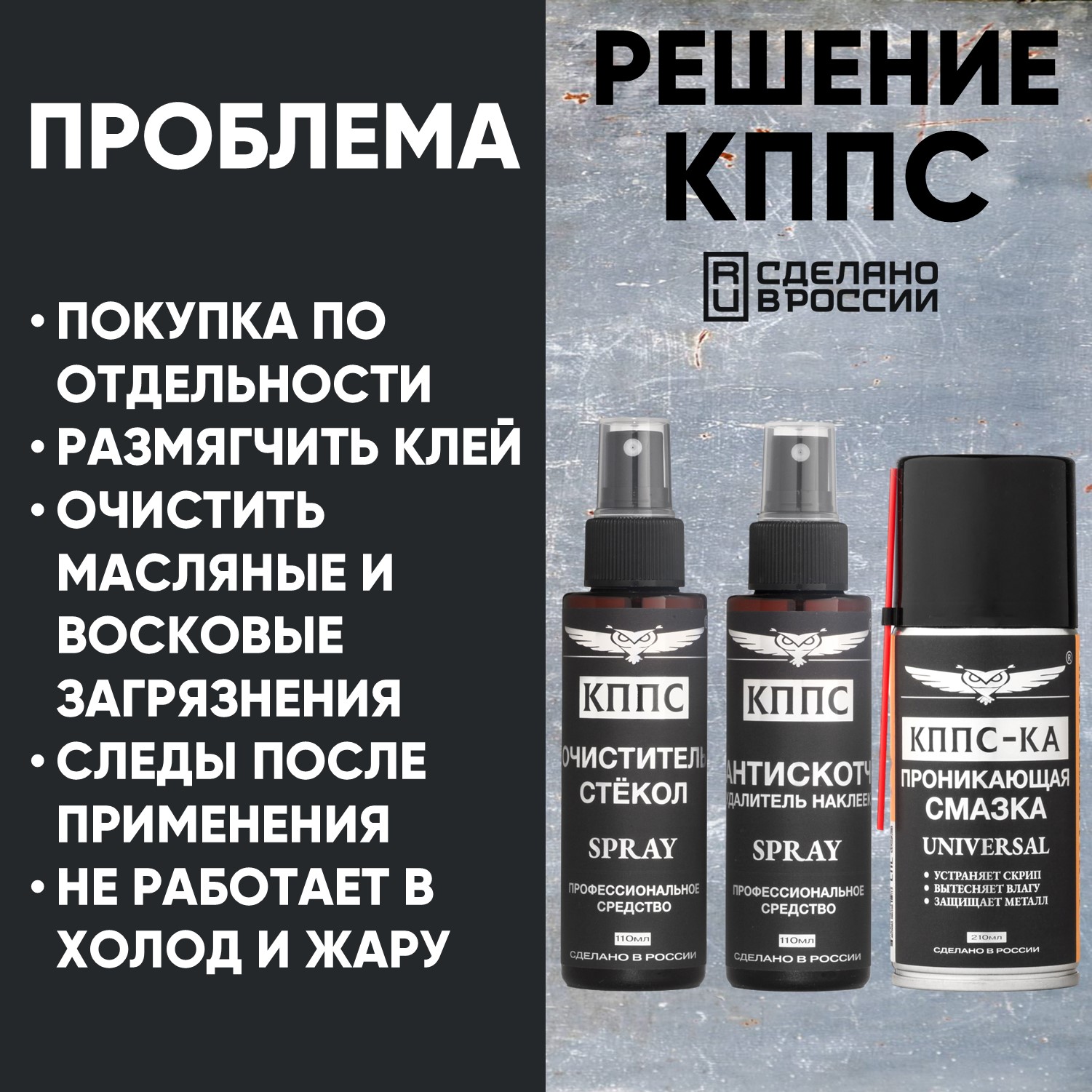 Технические характеристики Очиститель стёкол КППС SPRAY (110мл) + АНТИСКОТЧ удалитель наклеек КППС SPRAY (110 мл) + Проникающая смазка КППС-КА (210мл)