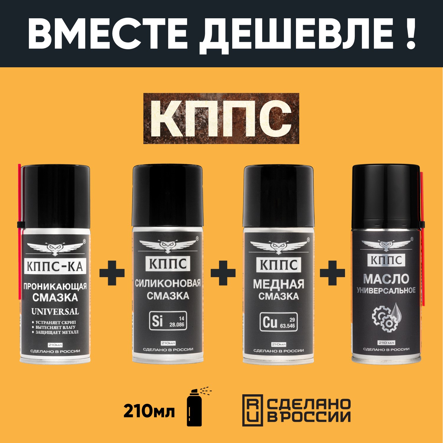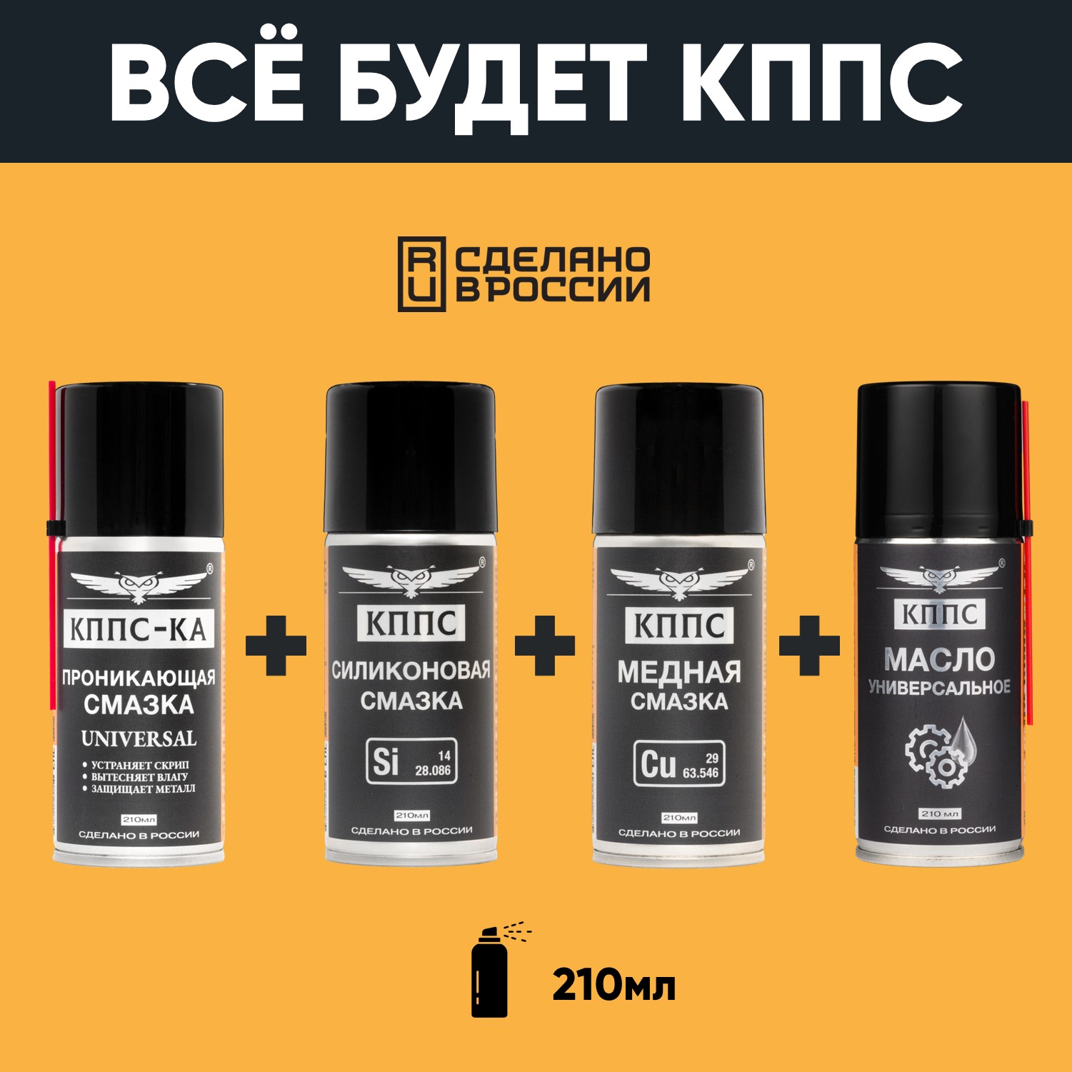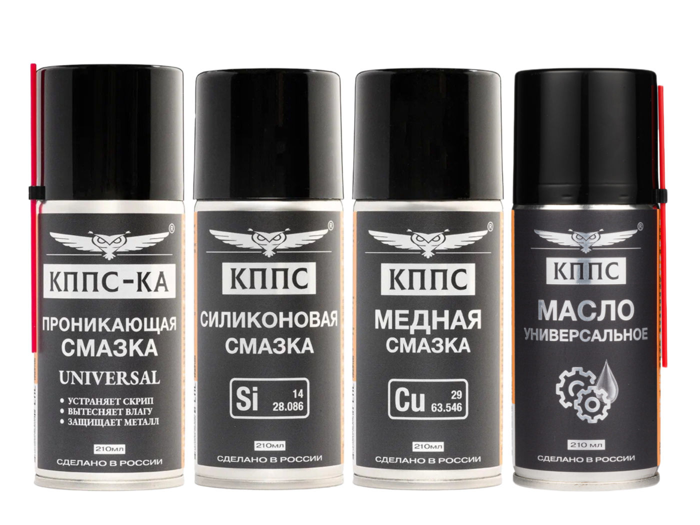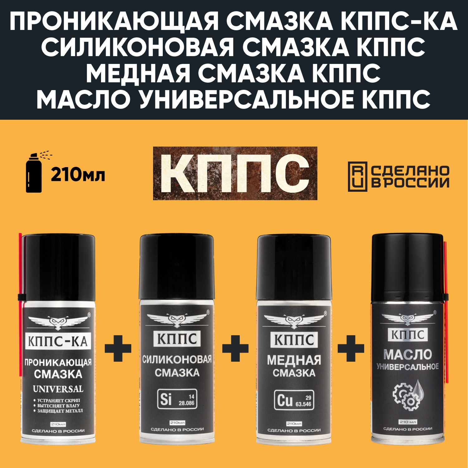 Проникающая смазка КППС-КА UNIVERSAL (210мл) + Силиконовая смазка КППС (210мл) + Медная смазка КППС (210мл) + Универсальное масло КППС (210мл)