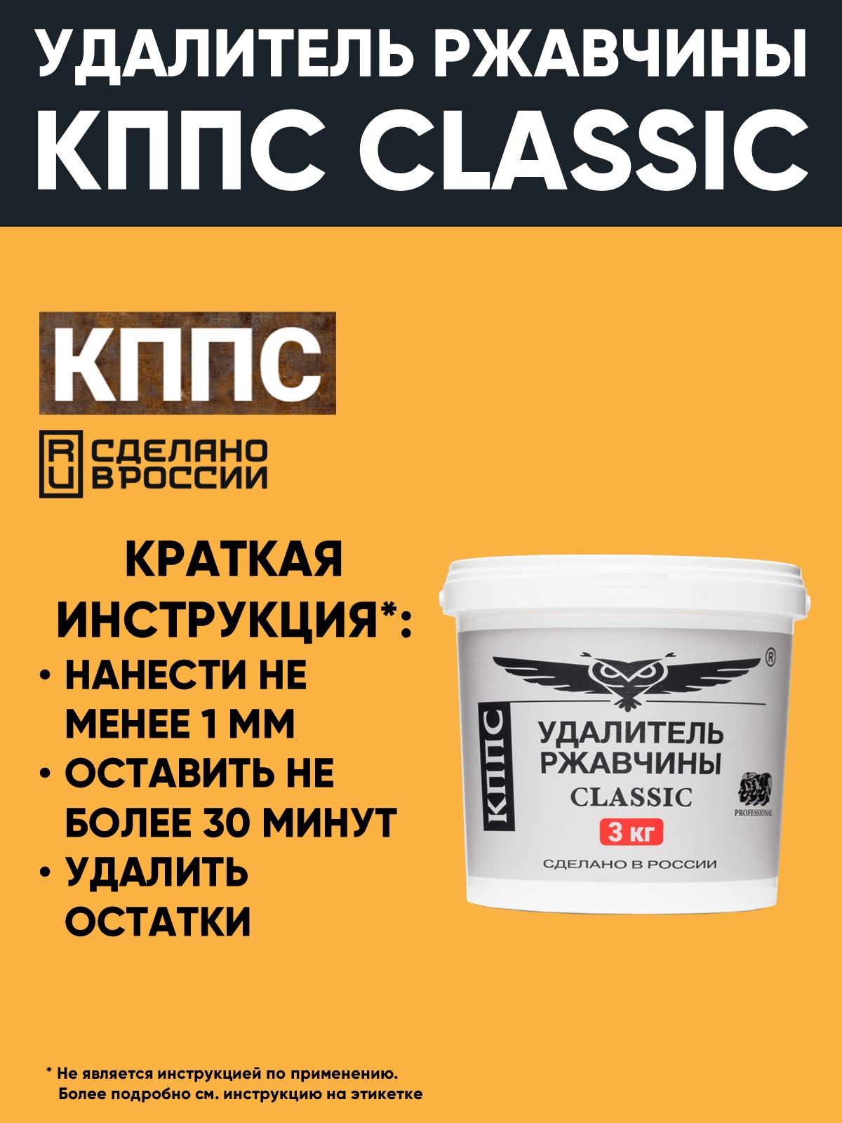 Удалитель ржавчины КППС CLASSIC – профессиональное средство для очищения поверхности от продуктов коррозии, ржавчины и стойких окалин до 3х мм. Консистенция геля позволяет составу не только очистить видимые поражения, а также проникнуть в поры и микротрещины для полной остановки процесса коррозии. КППС CLASSIC равномерно и удобно наносится на поверхность, обеспечивая экономичный расход, обработку локальных очагов. Очистка поверхности занимает до 30 минут. Гель эффективно справляется с ржавчиной на наклонных и вертикальных поверхностях. КППС CLASSIC способствует образованию защитной плёнки, а также обеспечивает высокий уровень адгезии последующего покрытия. Состав Удалителя ржавчины разработан не только для очистки видимых повреждений, но и для полной остановки разрушения. Удалитель ржавчины КППС CLASSIC качественно справится с коррозионными поражениями на любых металлоконструкциях: кузов авто, пороги, детали станков, ручной инструмент, полный или локальный ремонт заборов. Применение позволит удалить рыжики и стойкие окалины, подготовить поверхность к покраске, восстановить внешний вид металлических изделий. Избегайте попадания на ЛКП. При нарушении температурного режима хранения возможно изменение консистенции. В таком случае необходимо выдержать средство не менее 24 часов при комнатной температуре.