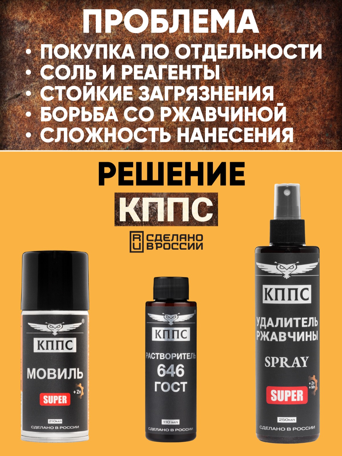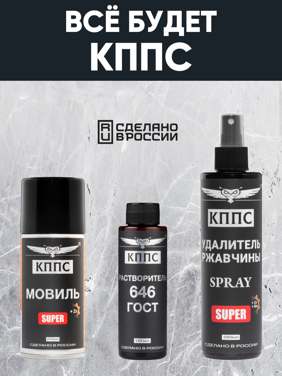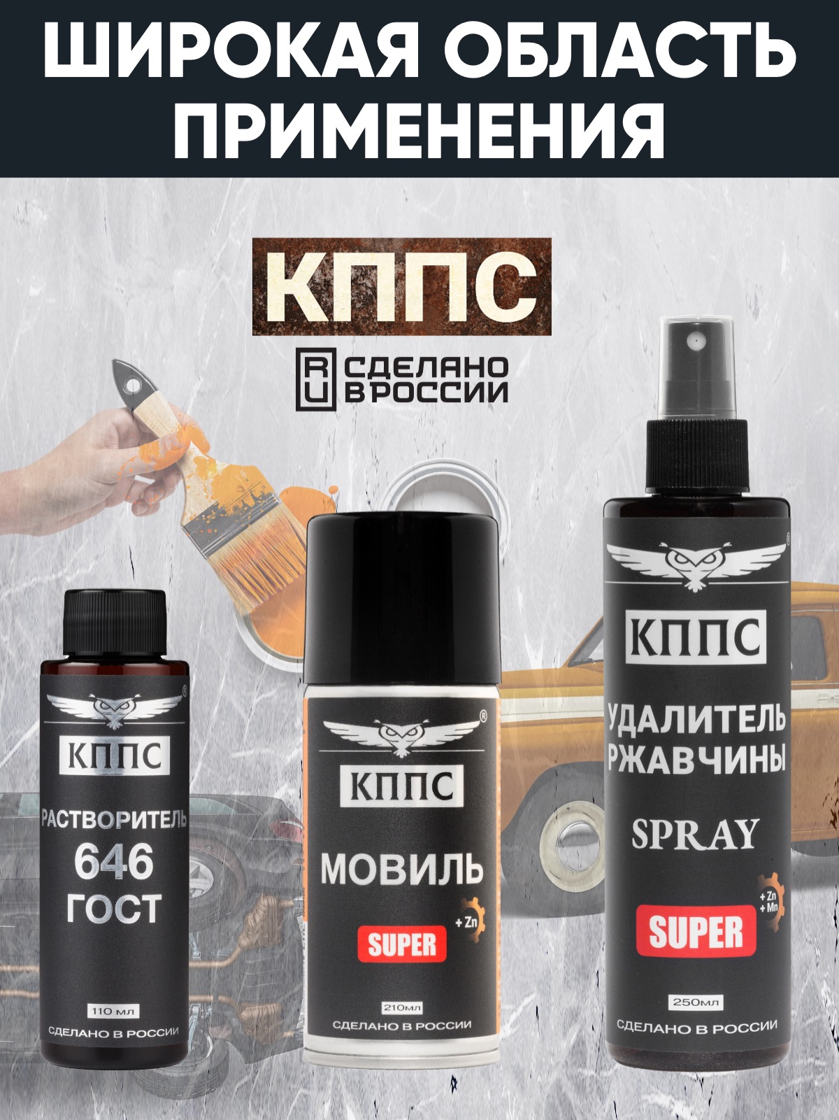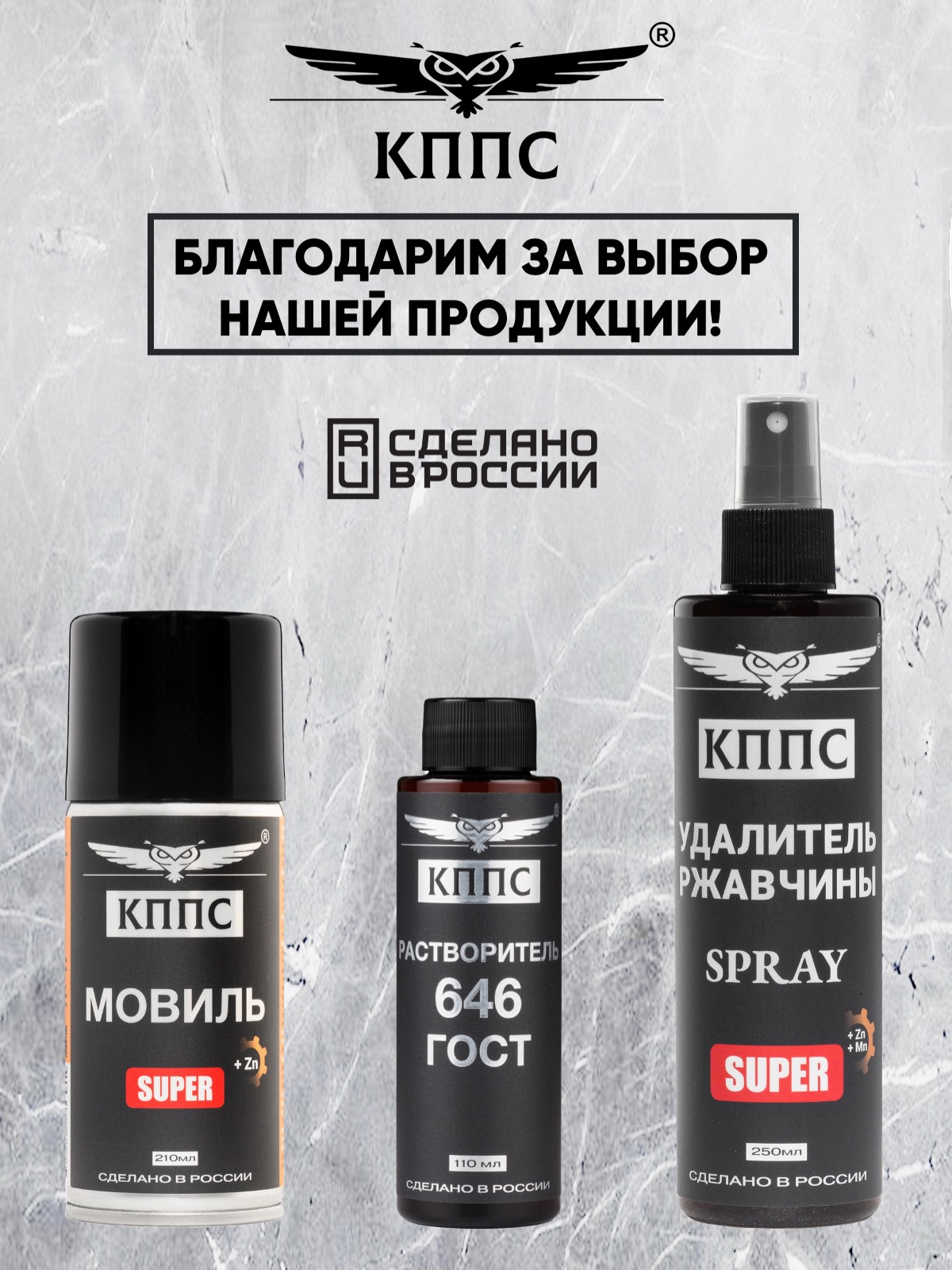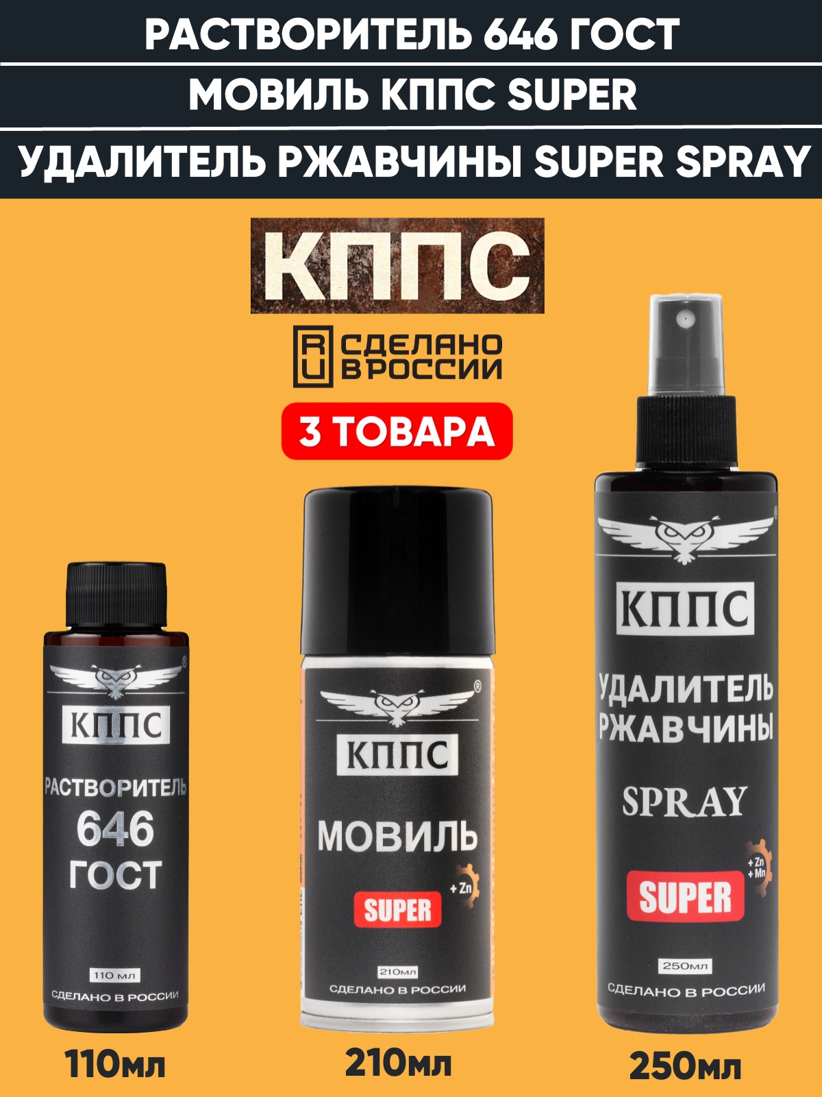Удалитель ржавчины КППС SPRAY SUPER (250мл) + Мовиль КППС SUPER (210 мл) + Растворитель КППС 646 ГОСТ (110мл)