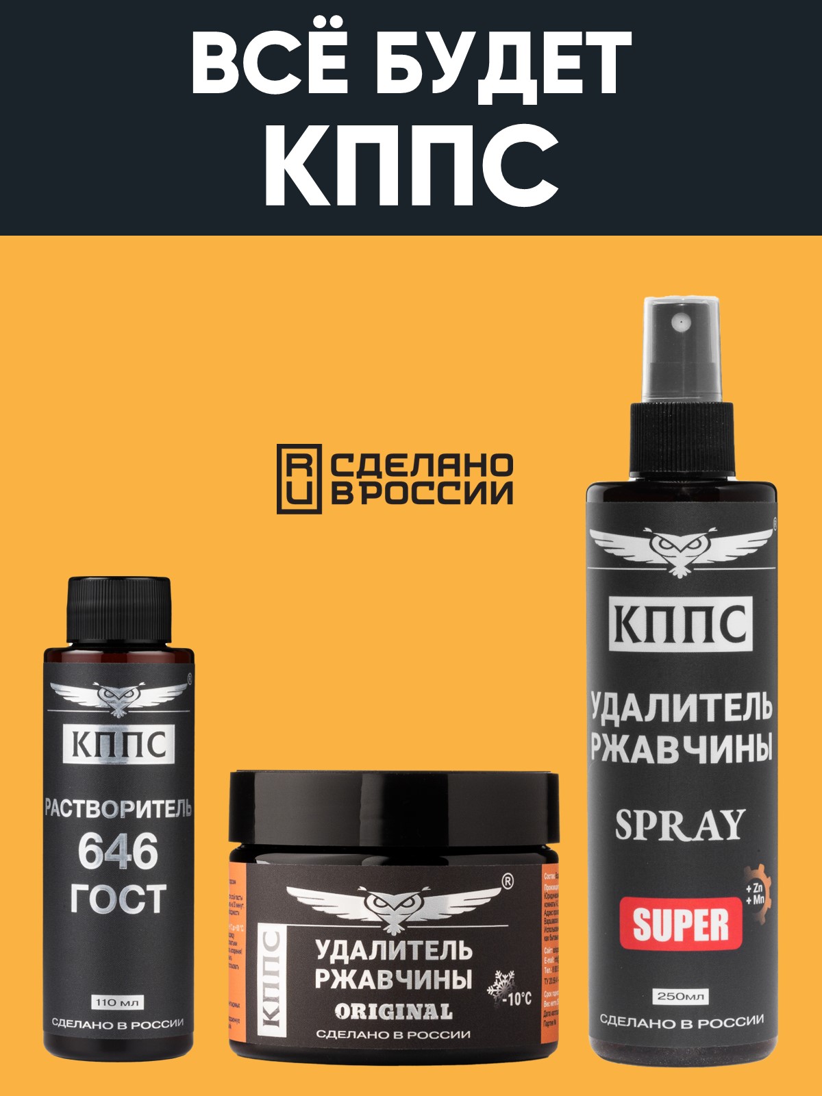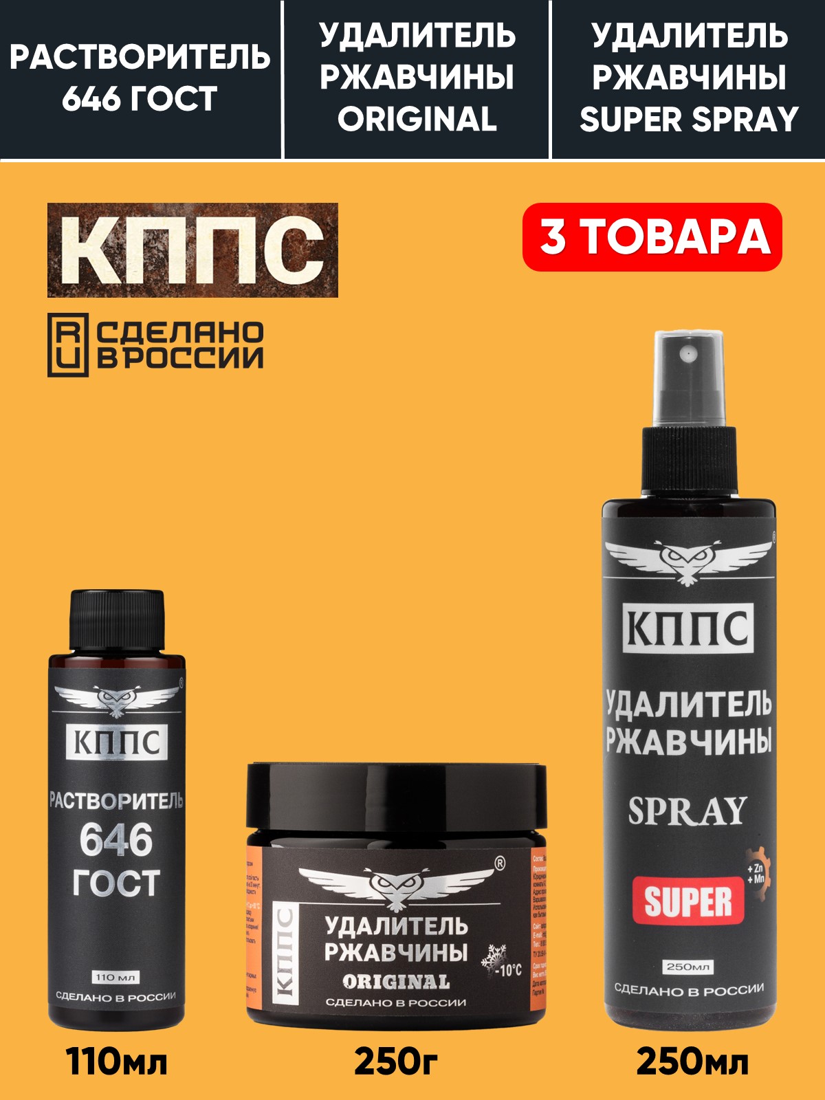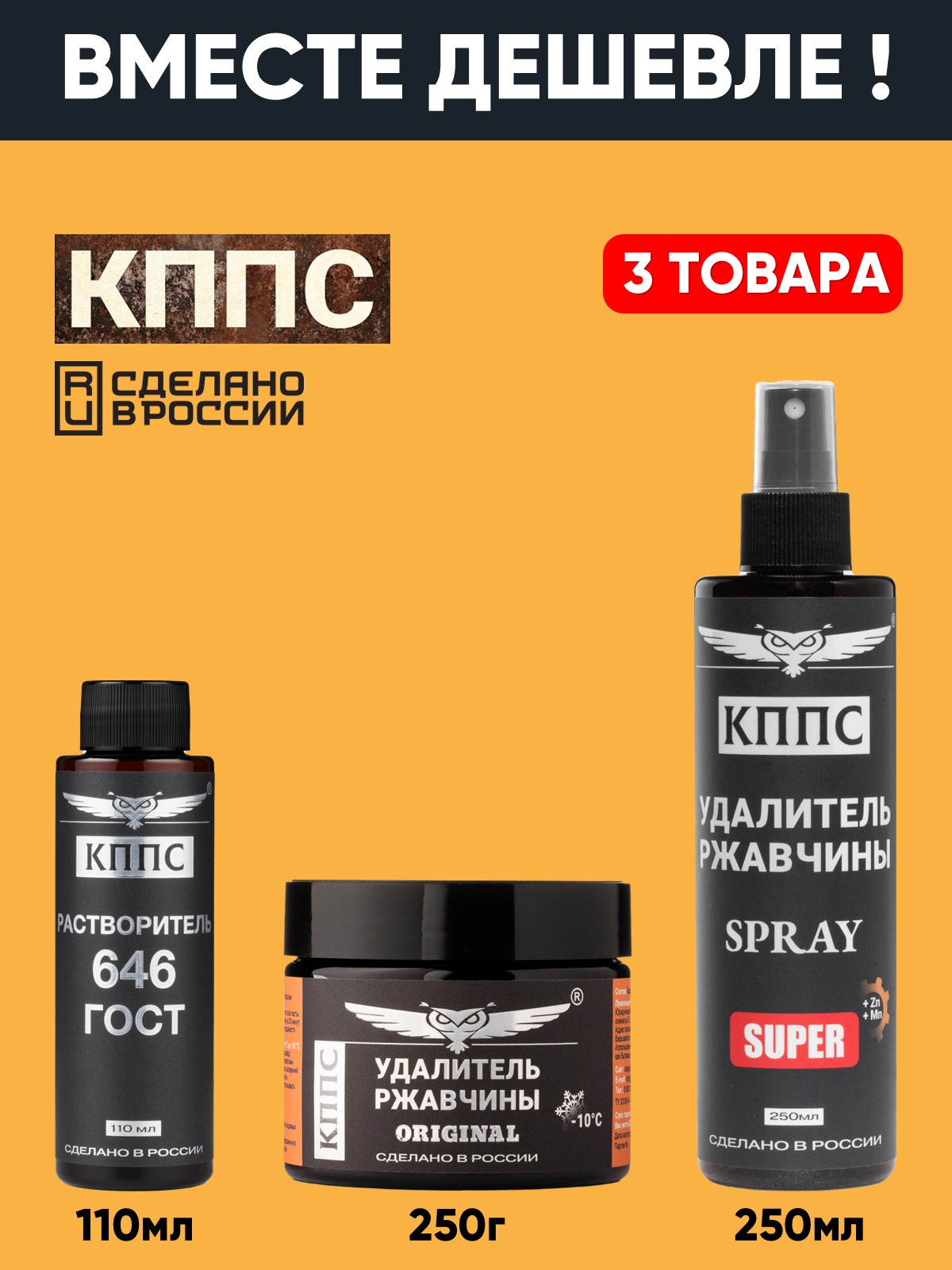 Удалитель ржавчины КППС SPRAY SUPER (250мл) + Удалитель ржавчины КППС ORIGINAL (250г) + Растворитель КППС 646 ГОСТ (110мл)