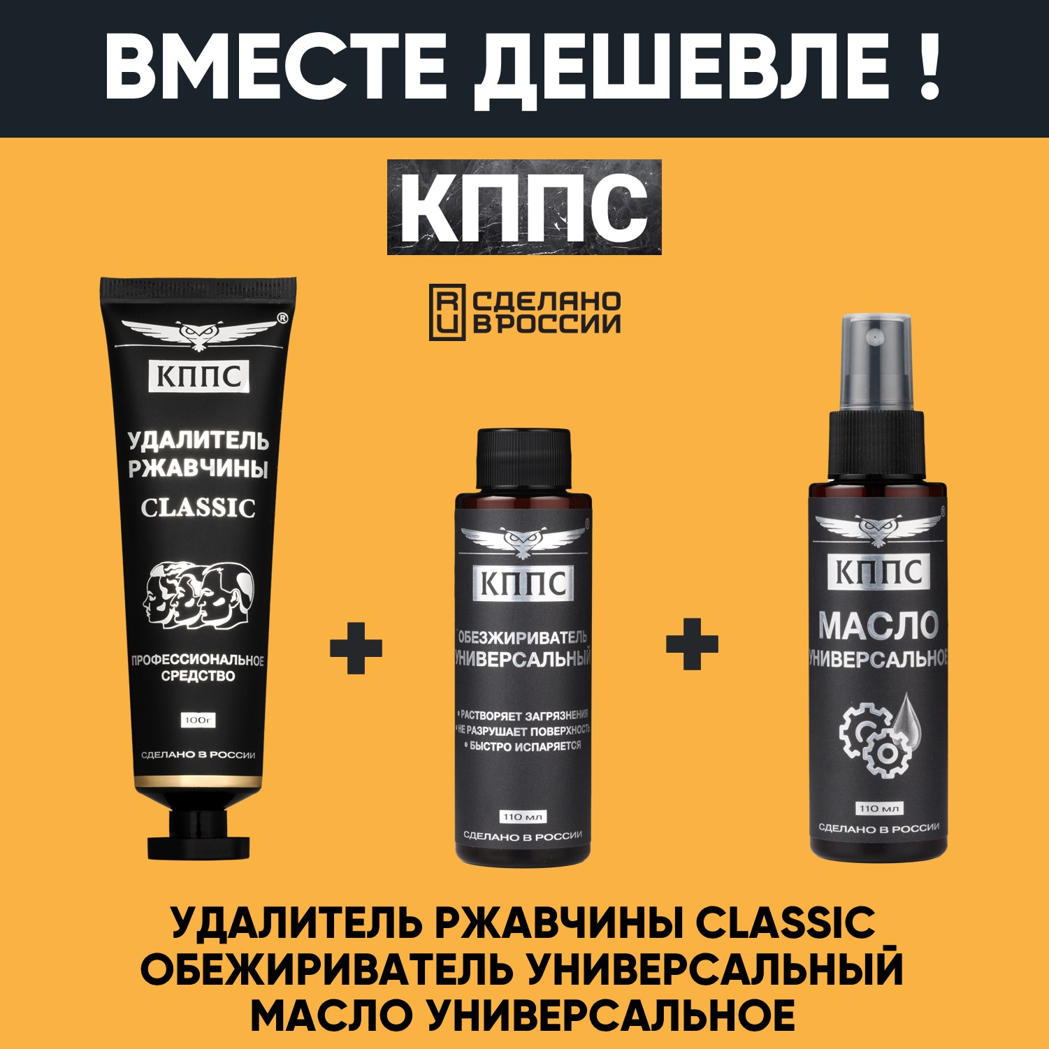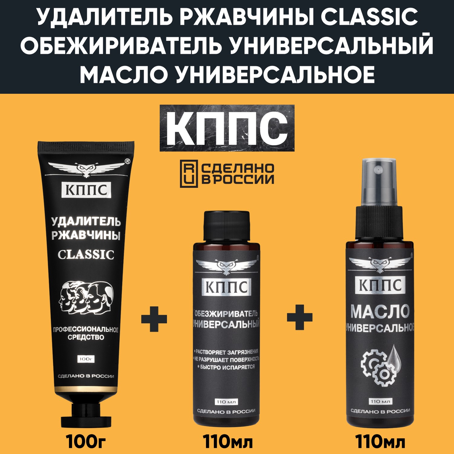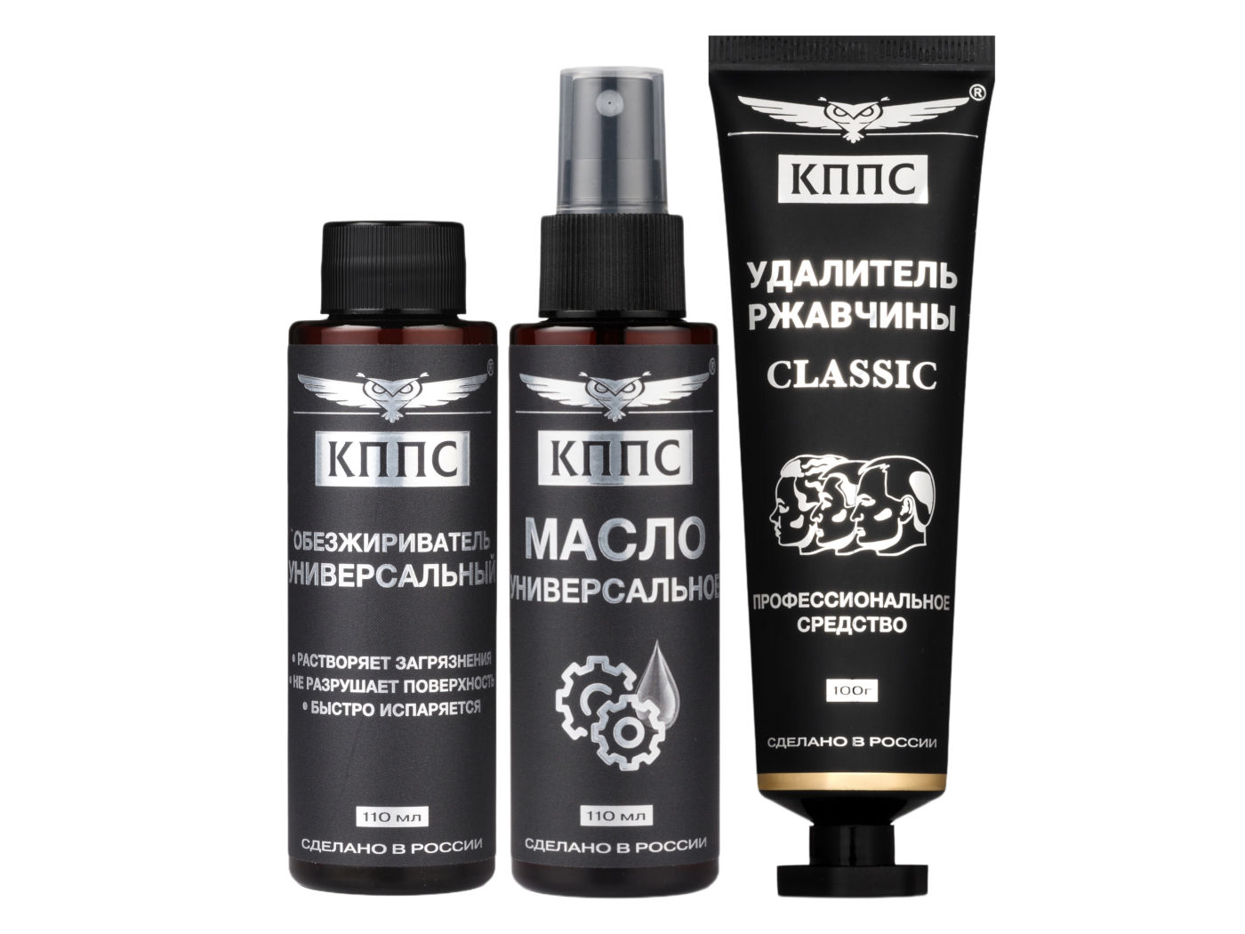 Универсальное масло КППС (спрей 110мл) + Удалитель ржавчины КППС CLASSIC (100г) + Универсальный обезжириватель КППС (110мл)