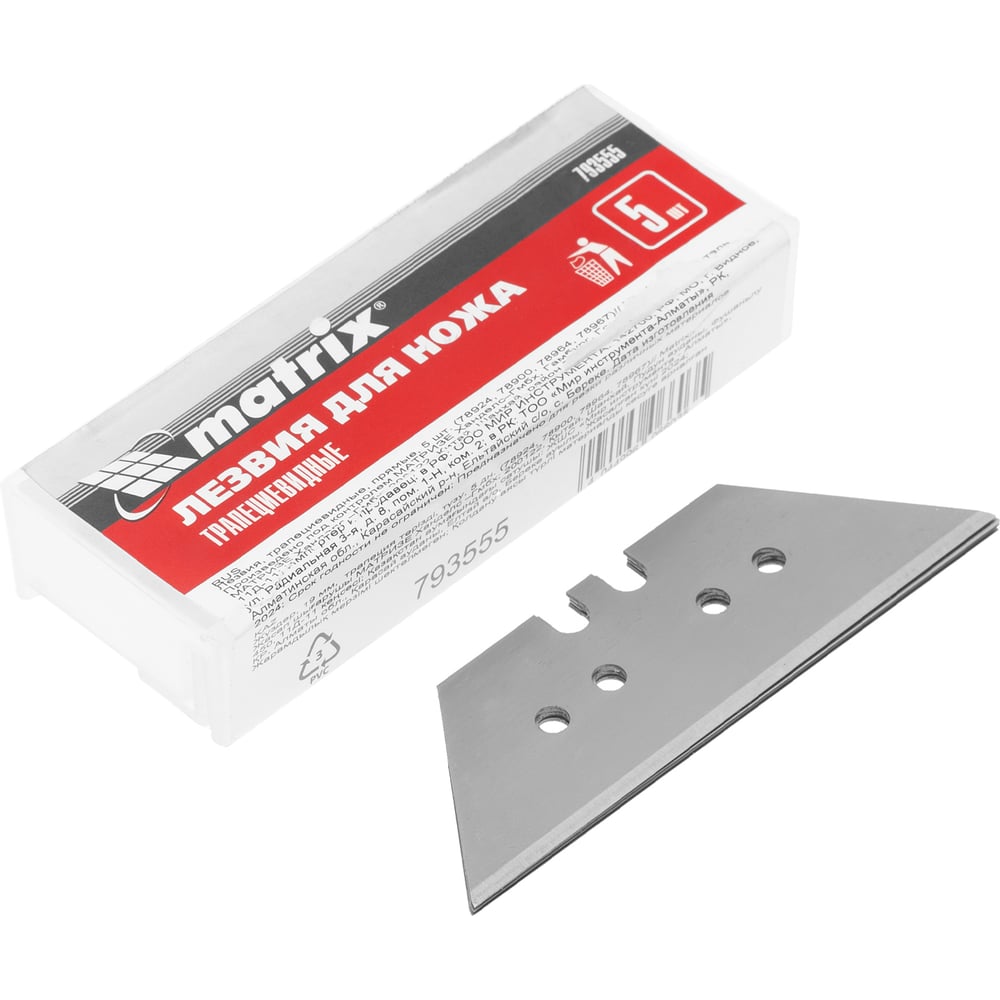 Прямые трапециевидные лезвия Matrix 793555 шириной 19 мм и длиной 61 мм, 5 шт. в упаковке, - сменные элементы для строительных ножей Matrix арт. 78924, 78964, 78900, 78967. Благодаря остро заточенным режущим кромкам они подходят для разрезания линолеума, картона, пластика, гипсокартона, раскройки обоев. Используются в профессиональной и бытовой сфере.