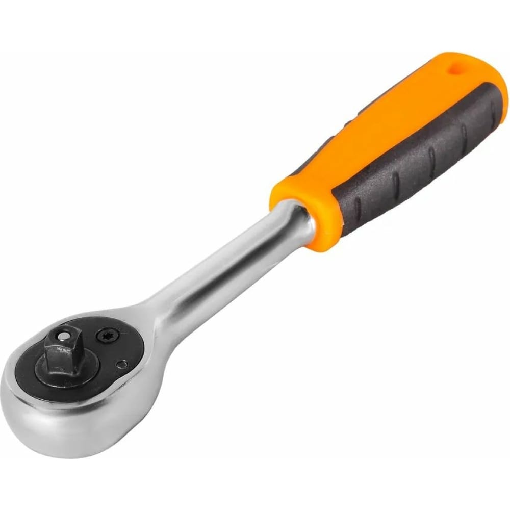 Трещотка предназначена для быстрого и эффективного закручивания или откручивания крепежа. Инструментом удобно пользоваться в условиях ограниченного пространства, когда нет возможности выполнить полный оборот вокруг гайки. Используется в быту и при авторемонте.Особенности:Рабочая часть изготовлена из CrV стали и обладает особой прочностью.Хромированное покрытие надёжно защищает трещотку от коррозии.Трещотка снабжена механизмом быстрого сброса насадок, что ускоряет процесс работы.Двухкомпонентная рукоятка не выскальзывает из ладони.Трещоточный 72-зубцовый механизм обеспечивает плавность хода, а малый угол поворота в 5° позволяет работать в ограниченном пространстве.Наличие в трещотке храпового механизма обеспечивает быструю смену направления вращения и упрощает работу в труднодоступных местах.