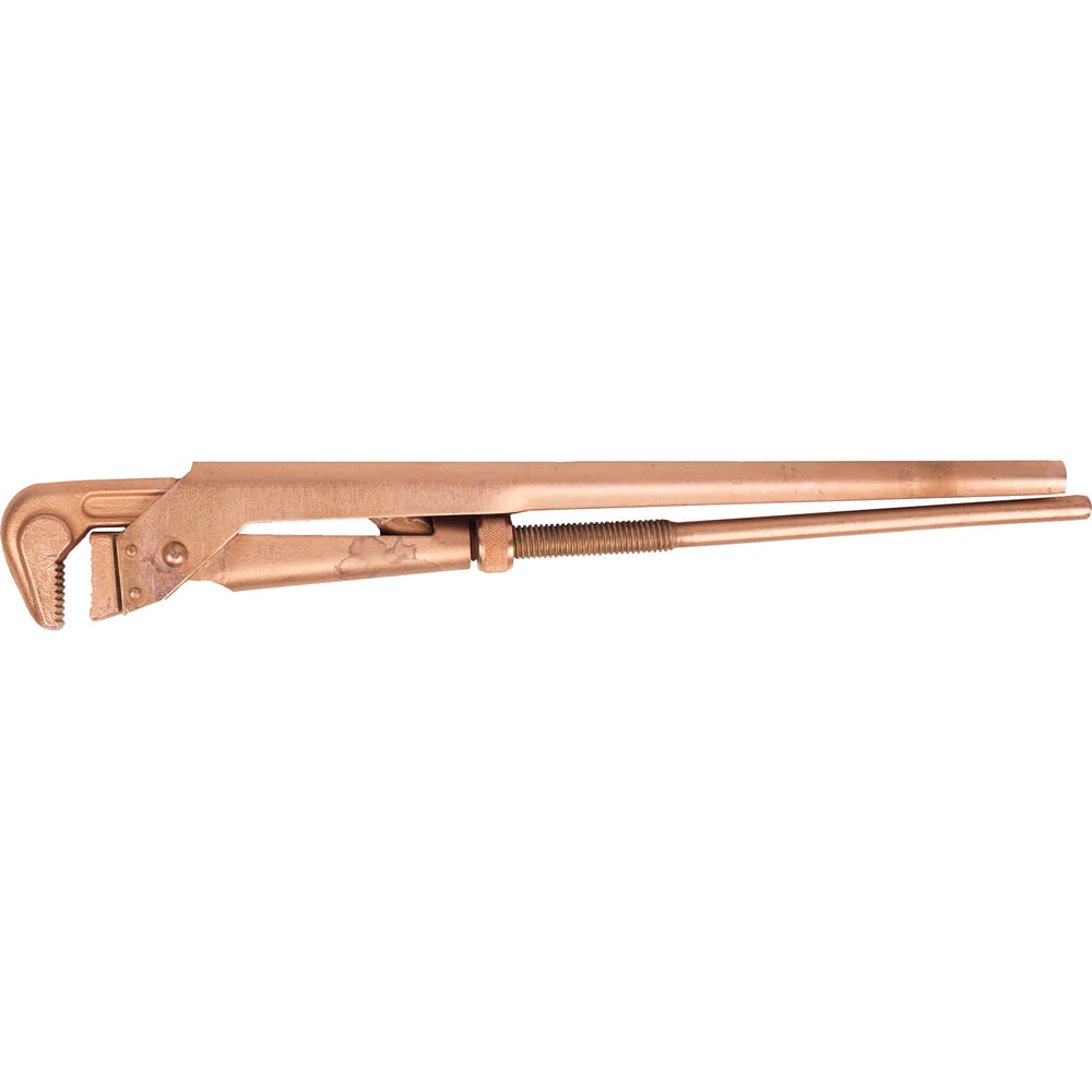 Трубный рычажный омедненный ключ предназначен для захватывания и вращения труб и соединительных частей трубопроводов. Ключ усиленной конструкции, удобен при работе в узком пространстве. Наклон зубьев против направления вращения. Покрытие инструмента медное, толщиной 30-50 мкм, выполнено электрохимическим способом. Соответствует требованиям нормативных документов ТУ 25.73.30-001-42865381-2020. Покрытие прочно сцеплено с основным металлом; Оттенок цвета не нормируется; На поверхности покрытия не являются браковочными следующие признаки — неоднородность цвета, темные или светлые полосы, темные следы от потеков; Условия хранения: омедненный инструмент должен храниться в закрытых сухих помещениях.