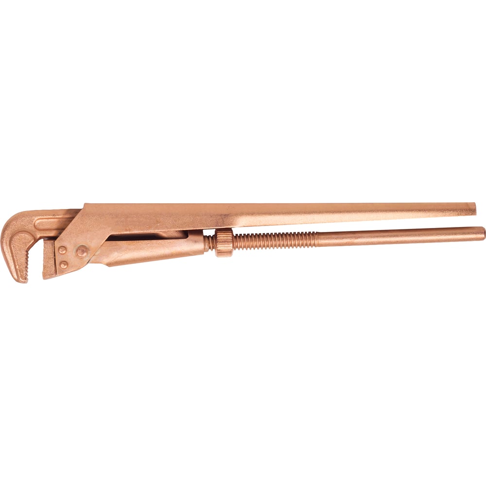 Трубный рычажный омедненный ключ предназначен для захватывания и вращения труб и соединительных частей трубопроводов. Ключ усиленной конструкции, удобен при работе в узком пространстве. Наклон зубьев против направления вращения. Покрытие инструмента медное, толщиной 30-50 мкм, выполнено электрохимическим способом. Соответствует требованиям нормативных документов ТУ 25.73.30-001-42865381-2020. Покрытие прочно сцеплено с основным металлом; Оттенок цвета не нормируется; На поверхности покрытия не являются браковочными следующие признаки — неоднородность цвета, темные или светлые полосы, темные следы от потеков; Условия хранения: омедненный инструмент должен храниться в закрытых сухих помещениях.