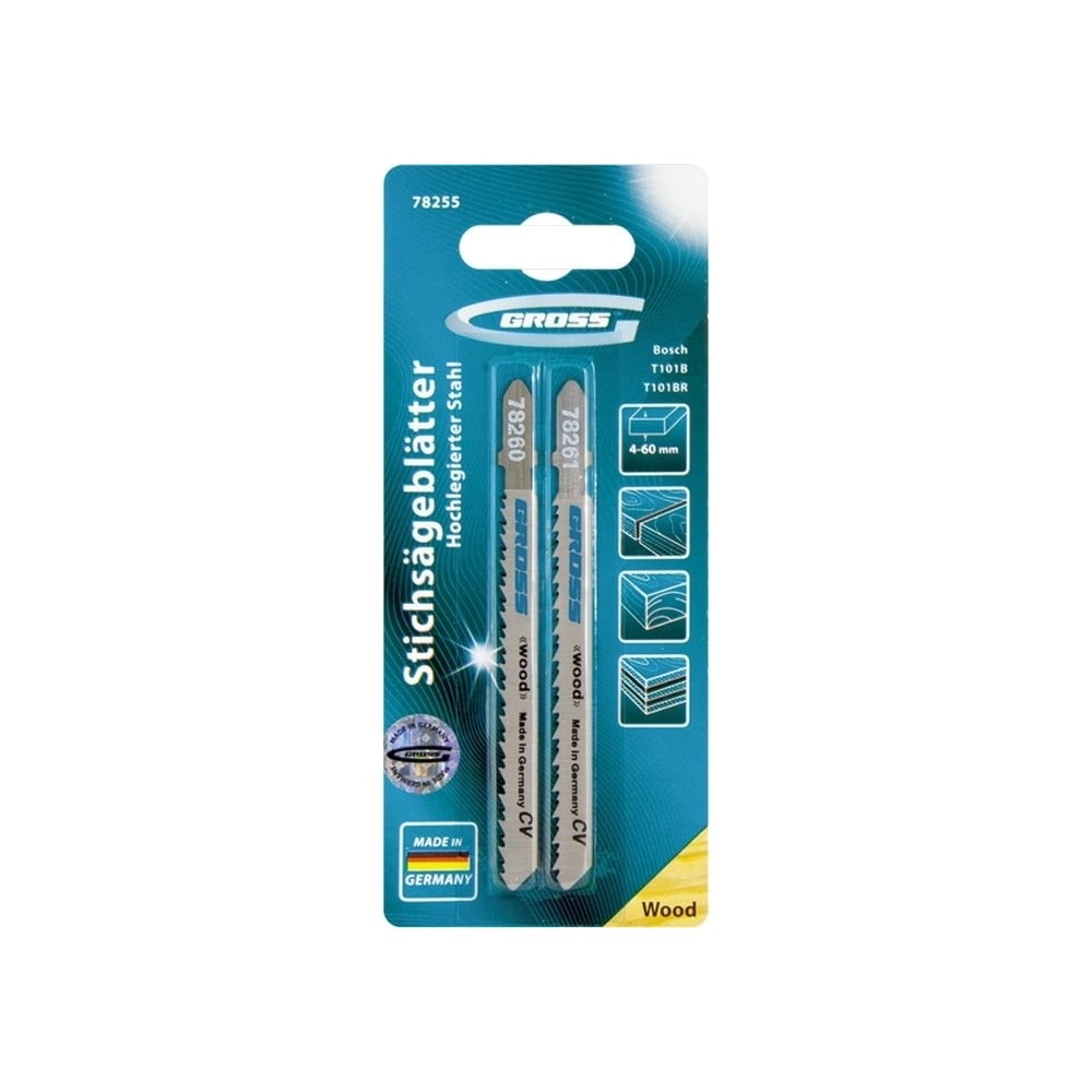 Набор полотен для электролобзика Gross 78255, 2шт. (T101B, T101BR), — это профессиональный инструмент для работ по дереву. Он рассчитан на распил древесины любых пород, а также фанеры, ДВП и пластика. Полотна позволяют осуществить чистый и быстрый рез. Благодаря длине 100 мм они справляются с распилом материалов толщиной 4-60 мм.