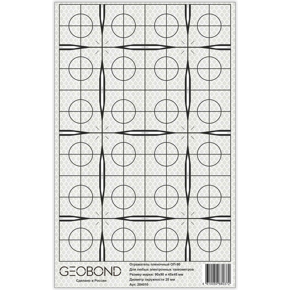 Отражатель ОП-90 пленочный GEOBOND 204010 используются с тахеометрами любых производителей. Изготовлены отражатели из новейшей высококачественной пленки призматического типа со сверхвысокой световозвращающей эффективностью. Коэффициент отражения данной пленки RA составляет 600 (кд/лк/ м2), что позволяет производить измерения на расстояниях до 500 метров. Поставляются одним листом с возможностью выбора размера отражателя под свои нужды. Отражатели Geobond ОП-90 имеют оригинальную форму, которая позволяет автономно использовать марку либо целиком (90 х 90 мм), либо 1/4 ее часть (45 х 45 мм). Это создает дополнительные удобства, т. к., приобретая всего один тип пленочного отражателя, пользователь имеет возможность, оптимально подбирать необходимый размер марки в зависимости от расстояний, на которых планируются измерения. К достоинствам разметки относятся бисекторные и контрбисекторные штрихи различной толщины, значительно упрощающие наведение на них, а также повышающие точность взятия углового отсчета при работе на больших расстояниях. Разметка пленочного отражателя нанесена специальной водостойкой краской, выдерживающей воздействия спирта и бензина, а сама пленка имеет гарантированный срок службы при уличной эксплуатации 10 лет.