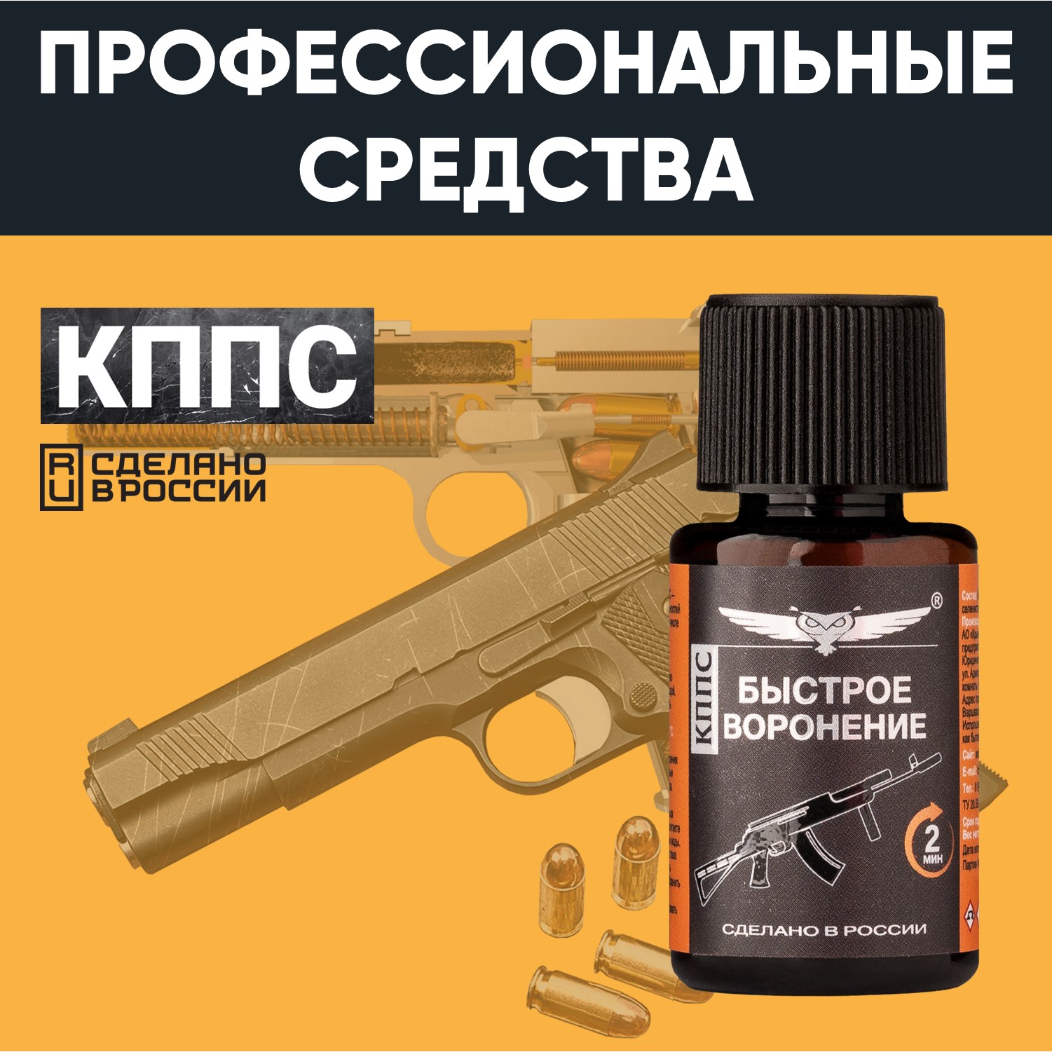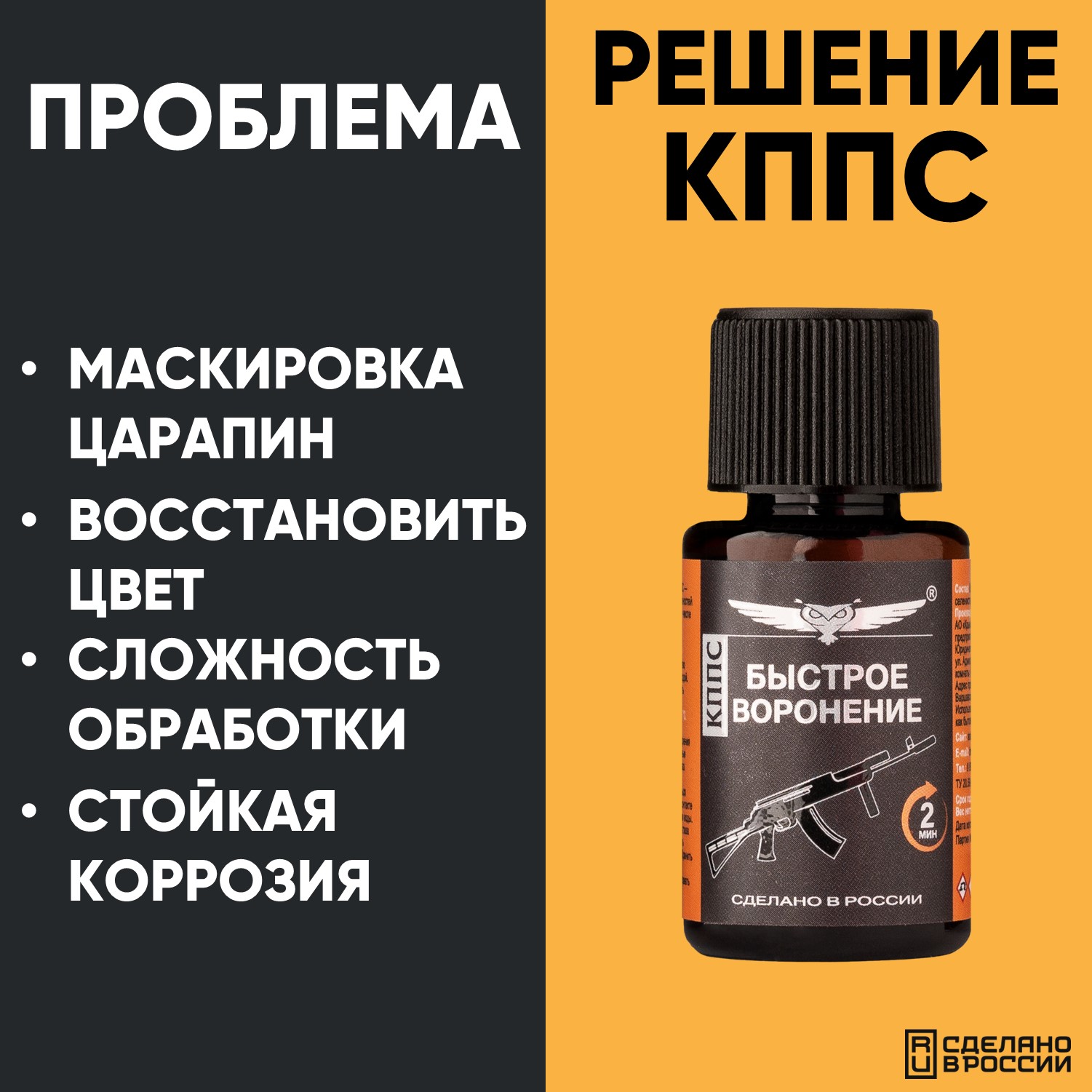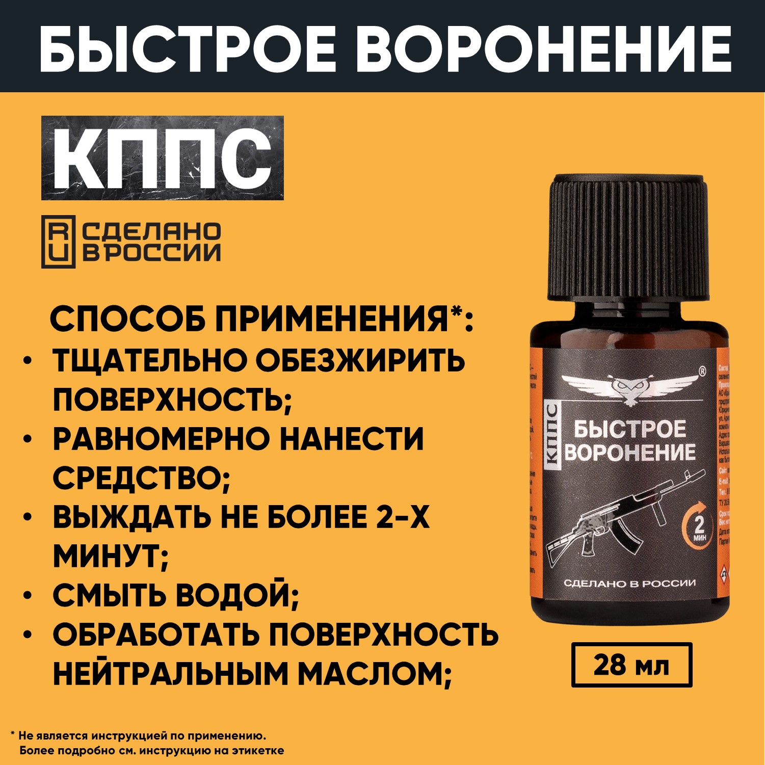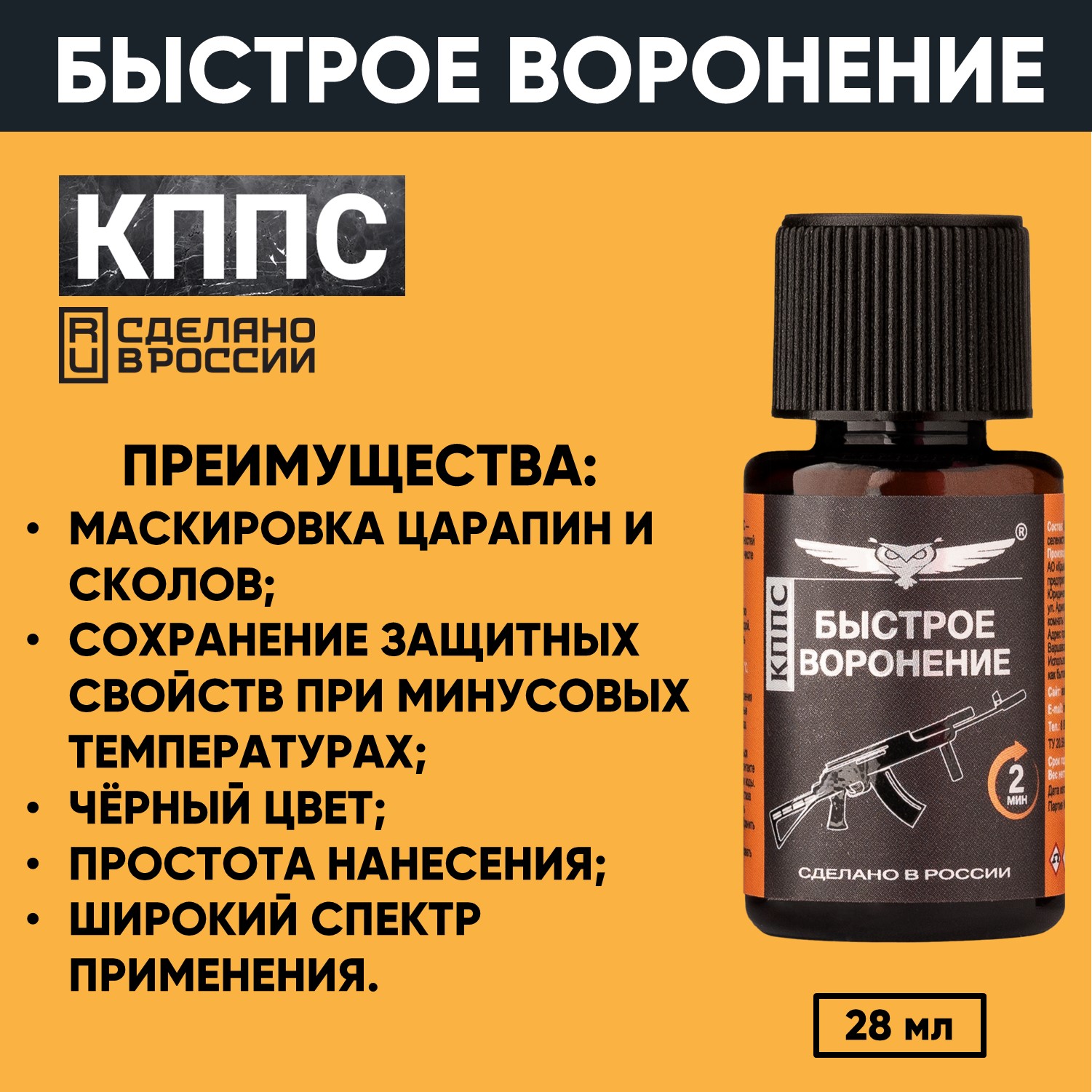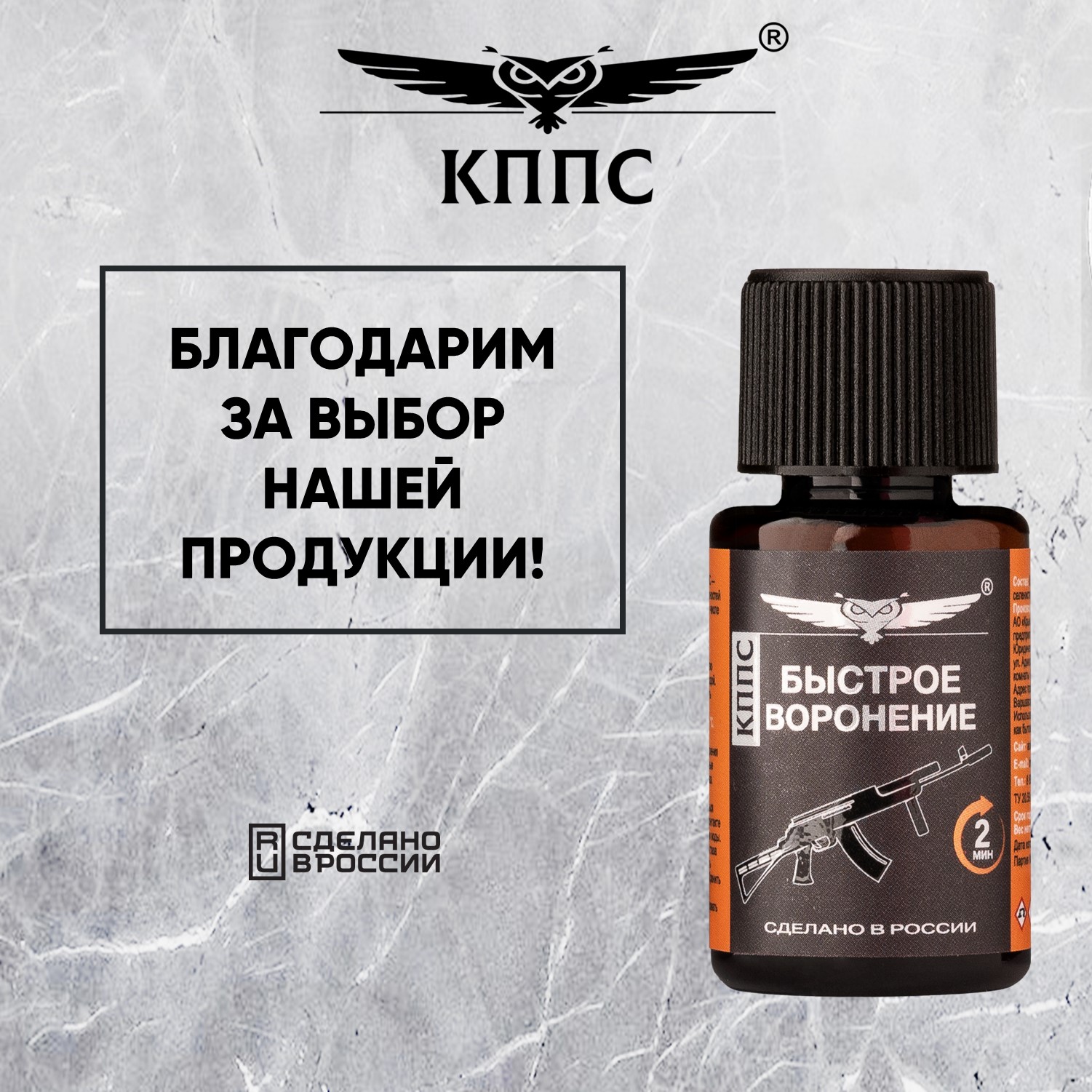 Быстрое воронение КППС – средство для холодного воронения ружейных и ствольных сталей, пневматического, огнестрельного и травматического оружия, ножей. Состав для воронения подходит для сталей с содержанием хрома не более 3%, а также марок 50А, 30ХН2МФ, 38ХСА. Применение Быстрого воронения КППС позволит вернуть декоративный вид металла, убрать царапины и потёртости, скрыть сколы, замаскировать задиры, восстановить блеск и чёрный цвет металла. Средство для холодного воронения КППС предназначено для нанесения покрытия без специальных знаний и навыков. Обработка поверхности займёт не более 2 минут. Быстрое воронение КППС способствует образованию покрытия, стойкого к истиранию, воздействию агрессивных сред и перепадам температур. Экономичный расход и компактная упаковка сочетают возможность обработки большой площади повреждения. Качество, насыщенность и однородность покрытия зависит от качества подготовленной поверхности. Для равномерного и стойкого цвета рекомендуем локально удалить с поверхности продукты коррозии и отполировать обрабатываемый участок.