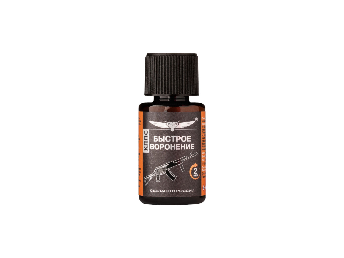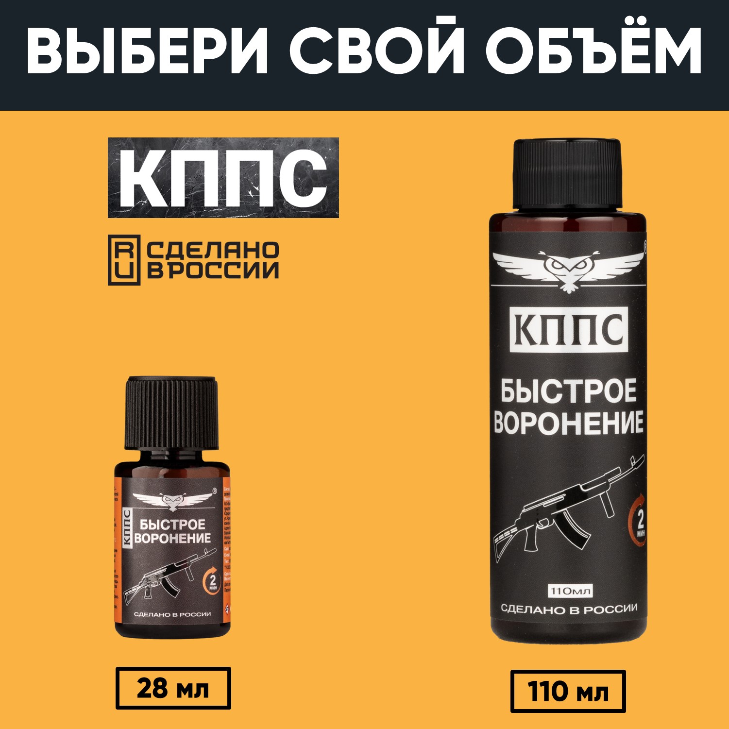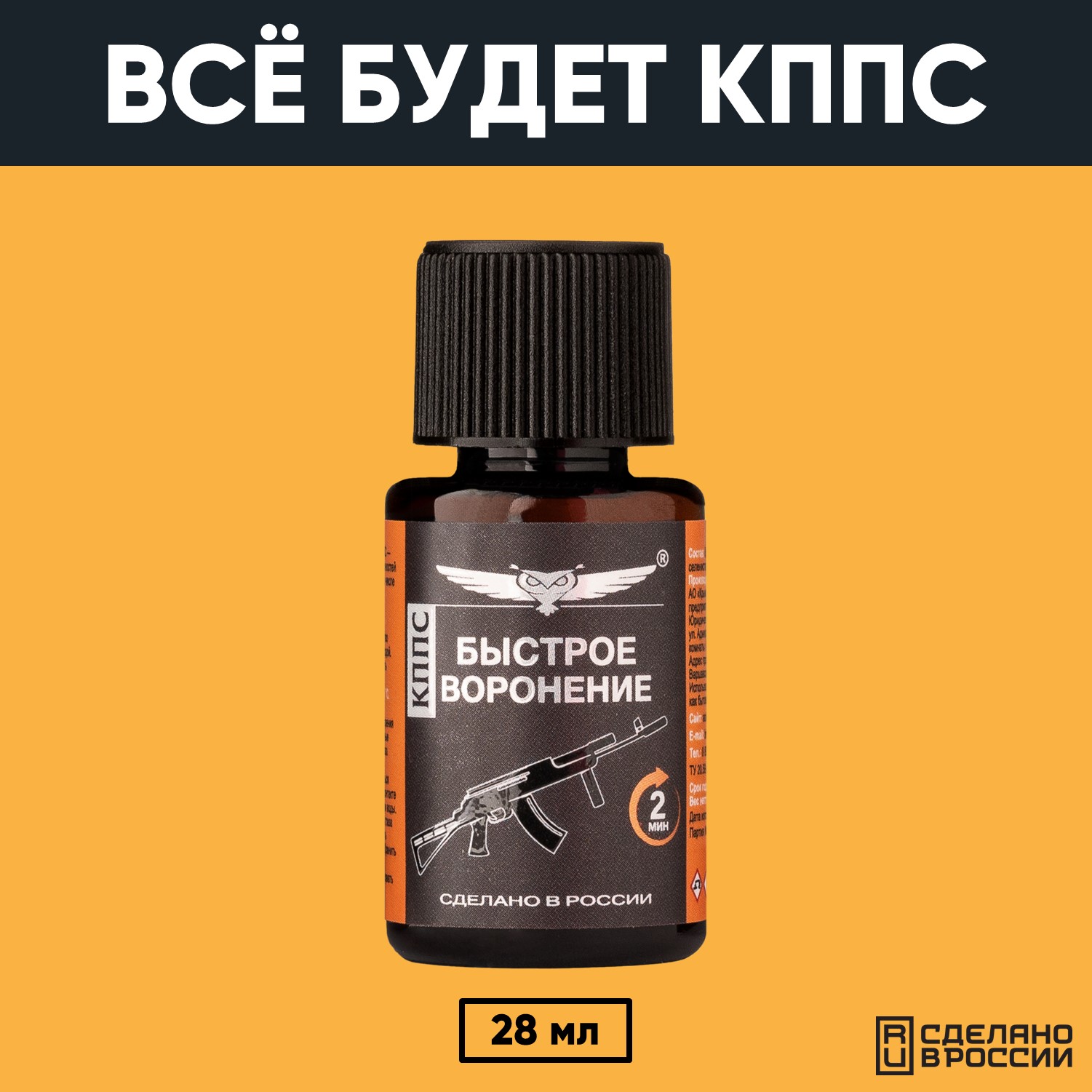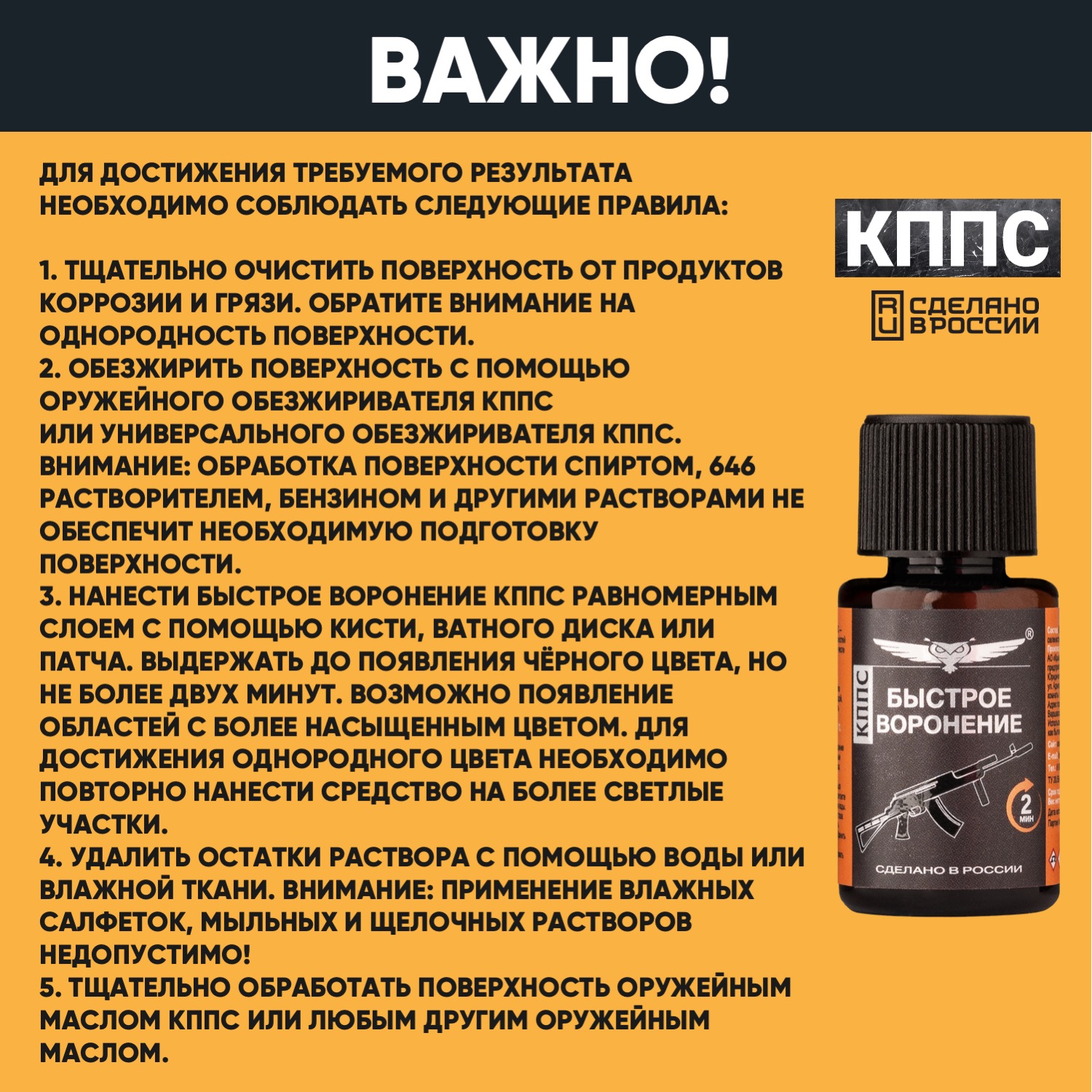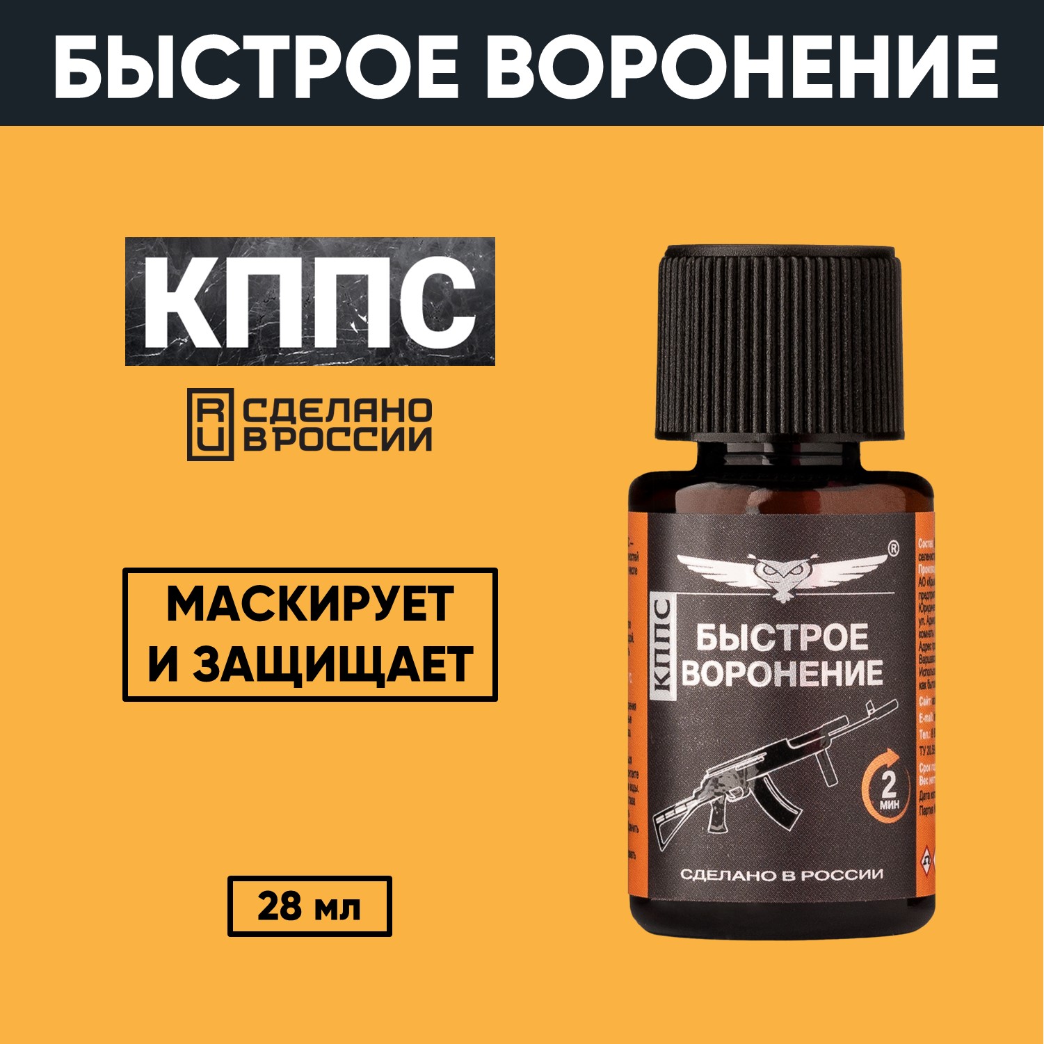 Быстрое воронение КППС – средство для холодного воронения ружейных и ствольных сталей, пневматического, огнестрельного и травматического оружия, ножей. Состав для воронения подходит для сталей с содержанием хрома не более 3%, а также марок 50А, 30ХН2МФ, 38ХСА. Применение Быстрого воронения КППС позволит вернуть декоративный вид металла, убрать царапины и потёртости, скрыть сколы, замаскировать задиры, восстановить блеск и чёрный цвет металла. Средство для холодного воронения КППС предназначено для нанесения покрытия без специальных знаний и навыков. Обработка поверхности займёт не более 2 минут. Быстрое воронение КППС способствует образованию покрытия, стойкого к истиранию, воздействию агрессивных сред и перепадам температур. Экономичный расход и компактная упаковка сочетают возможность обработки большой площади повреждения. Качество, насыщенность и однородность покрытия зависит от качества подготовленной поверхности. Для равномерного и стойкого цвета рекомендуем локально удалить с поверхности продукты коррозии и отполировать обрабатываемый участок.