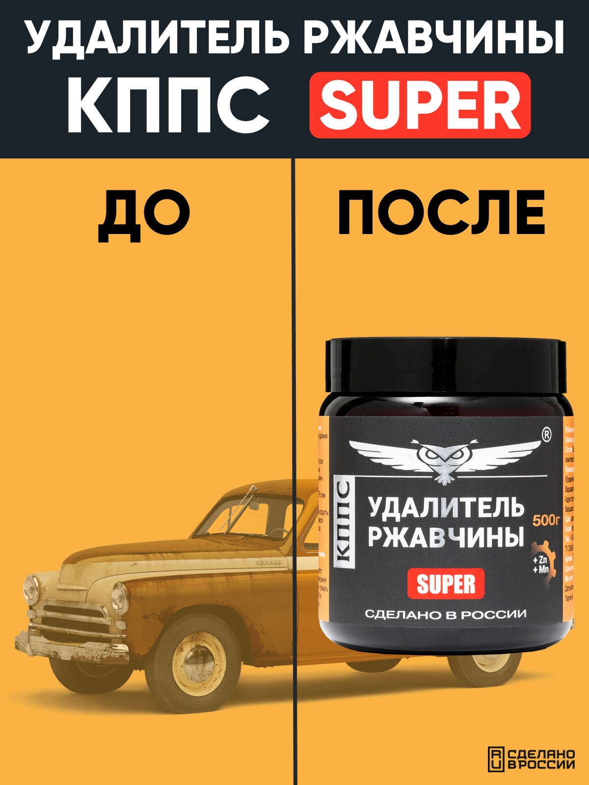 Применение УДАЛИТЕЛЯ РЖАВЧИНЫ КППС SUPER позволит подготовить к покраске любые металлические конструкции (кузов и пороги автомобиля, заборы и гаражи, трубы, сварные швы). За счёт уникальной консистенции средство проникает глубоко в поражения и растворяет даже прикипевшую ржавчину. При нанесении Удалителя ржавчины КППС SUPER происходит растворение оксида железа и дополнительной реакции солей цинка с поверхностью. Метод удаления продуктов коррозии в несколько раз эффективнее преобразования ржавчины. После обработки металлических изделий КППС SUPER достаточно обработать поверхность 646 растворителем и приступить к нанесению лакокрасочного покрытия.